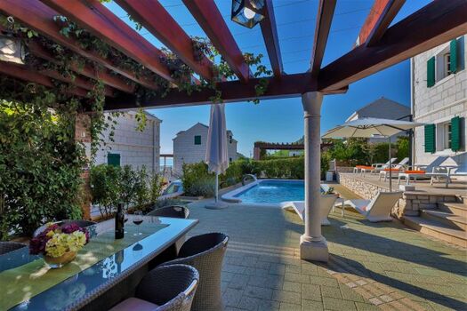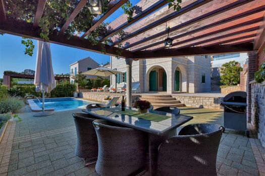 Die Villa verfügt über eine große Terrasse mit privatem beheiztem Pool von 24m², überdachten Sitzgelegenheiten und Grill, Gartenmöbel, Liegen und Sonnenschirme.