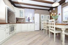 Gasofen / Gasherd, Dunstabzugshaube, Kühlschrank mit Gefrierfach, Gefrierschrank, Kaffeevollautomat, Mixer, Korkenzieher / Flaschenöffner, Gewürze (Salz, Pfeffer, Zucker), Geschirrhandtücher, Mülltüten, Essplatz in der Küche, TV in der Küche