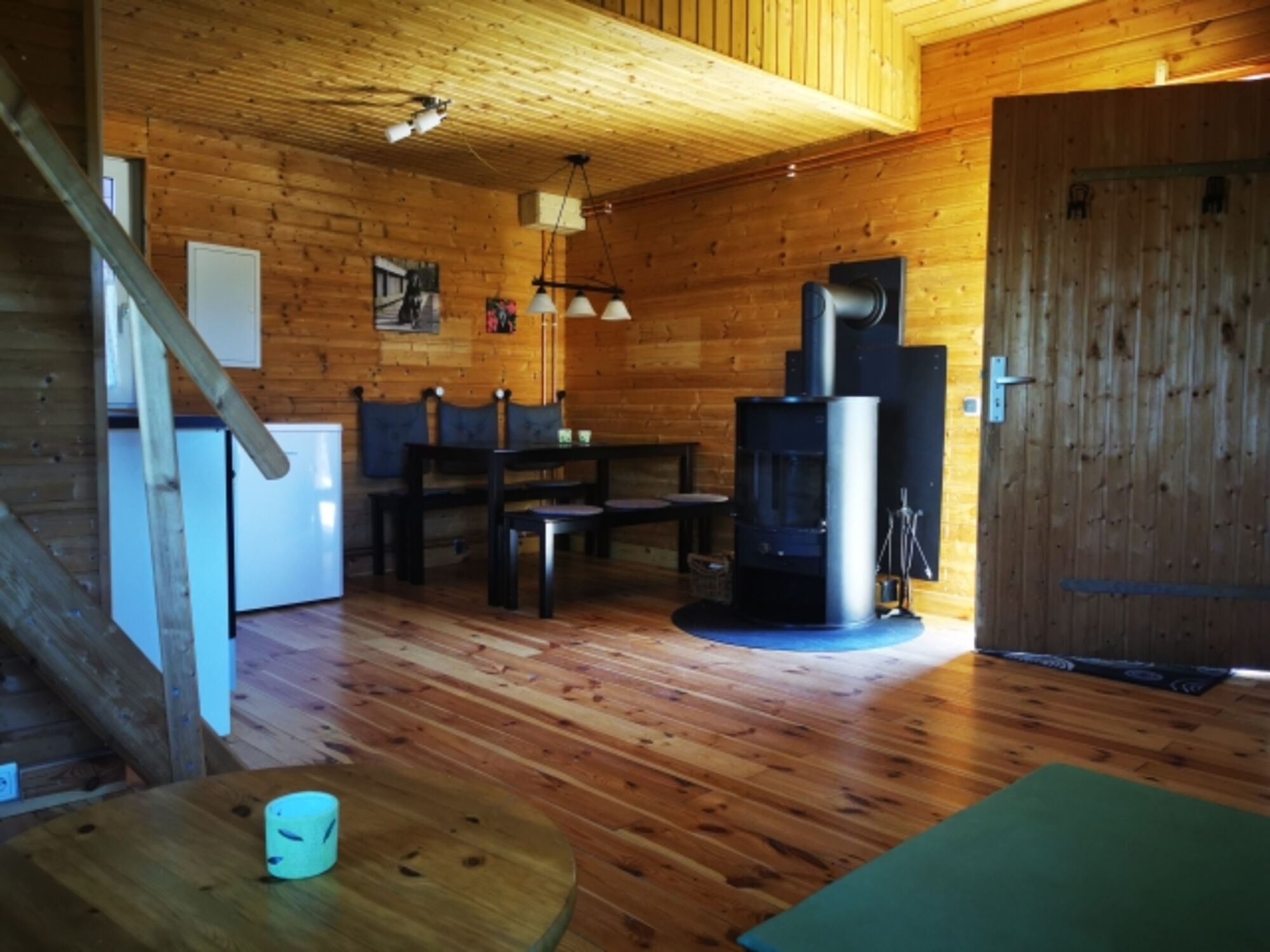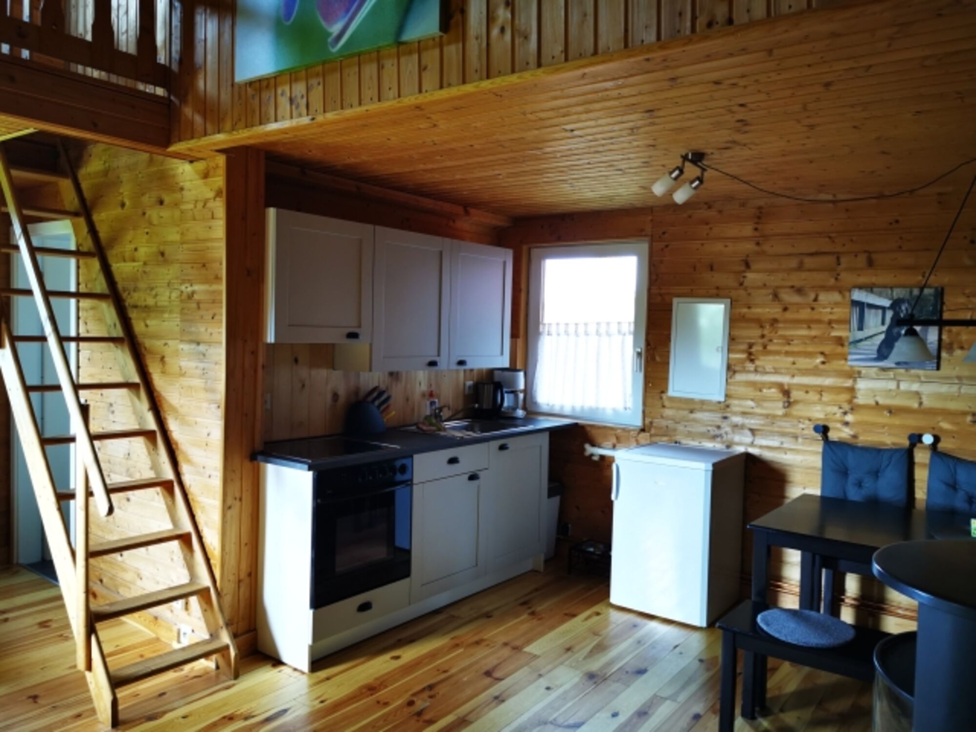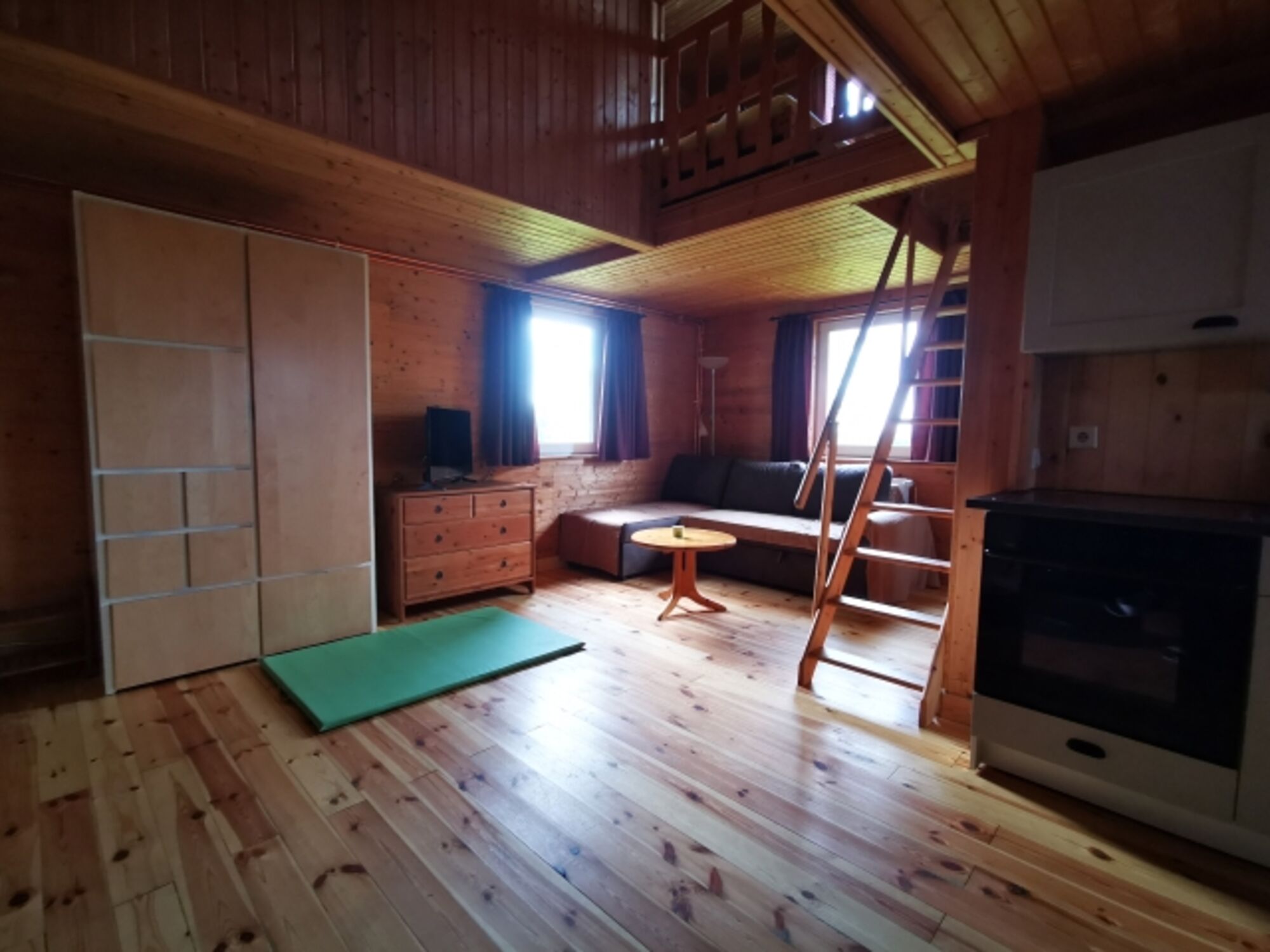 Unser Haus Laika ist ein rustikales Holzhaus. Es verfügt über eine Wohnküche mit Esstisch sowie einen gemütlichen Couchbereich. Der Kaminofen lädt zu Gemütlichkeit ein. In der Schlafgalerie im Obergeschoss befinden sich 2 Doppelbetten (140 x 200 cm). Ein Duschbad komplettiert die Einrichtung.