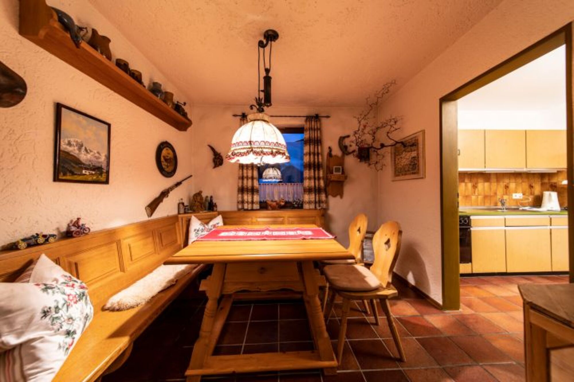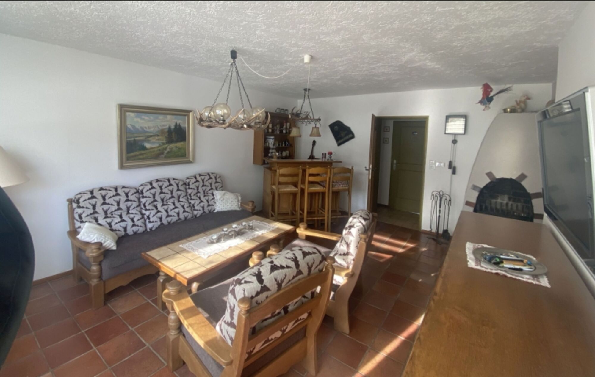 Im behaglichen Wohnbereich finden Sie eine rustikale Essecke, die direkt in eine voll ausgestattete, separate Küche übergeht – hier bleiben keine Wünsche offen. Eine stilvolle Bar mit Barhockern und ein offener Kamin sorgen an kühlen Abenden für zusätzliche Wohlfühlmomente.