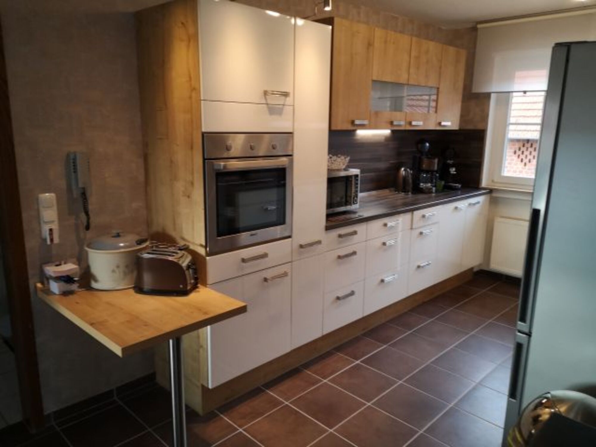 Cerankochfeld, Dunstabzugshaube, Gefrierschrank, Kaffeevollautomat, Senseo-Kaffeeautomat, Mixer, Waffeleisen, Korkenzieher / Flaschenöffner, Gewürze (Salz, Pfeffer, Zucker), Geschirrhandtücher, Mülltüten