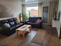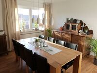 Zur Ferienwohnung gehören zwei Balkone und ein großer eingezäunter Garten. Großes Wohnzimmer mit Sofas und Sessel sowie Sat-TV. Die große Einbauküche mit angrenzend geräumigem Essbereich ist komplett mit allen Dingen des täglichen Lebens ausgestattet. Auch eine Grundaustattung an Backformen sowie ein Mixer ist vorhanden. Die drei Schlafzimmer stellen wir entsprechend der Personenzahl zur Verfügung. Modernes Tageslichtbad mit Badewanne und Dusche. Über den Flur gelangt man auf den zweiten überdachten Balkon der wiederum über eine kleine Treppe Zugang zum großen überdachten Freisitz mit Grill und Garten hat. Aus hygienischen Gründen sind in der Wohnung alle Fußböden wischbar und die Sofas sind mit Überdecken ausgestattet.