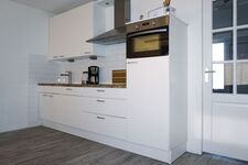 Die offene und vollausgestattete Küche ist in den modernen Wohnbereich integriert. Neben Kochfeld, Backofen und Spülmaschine verfügt die Küchenzeile auch über eine Filterkaffeemaschine und einen Wasserkocher. Wer gerne kocht, ist in der „Auszeit“ gut untergebracht.