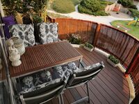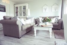 Im lichtdurchfluteten Wohnzimmer lässt sich die Auszeit hervorragend genießen. Auf den zwei großen Polstersofas finden bei Bedarf auch mehrere Personen bequem Platz. Neben einem großen Flat-TV gibt es hier auch einen Bio-Ethanol-Kamin für entspannte Abendstunden auf der Insel. Im separaten Essbereich finden Sie ausreichend Raum für gemeinsame Mahlzeiten oder für gemütliche Abendrunden. Am großen Esstisch stehen hierfür mehrere Stühle und eine bequeme Sitzbank bereit - und natürlich ein großer Balkon der zum geschützten, zentralen Garten und zur sonnigen Südseite ausgerichtet ist.