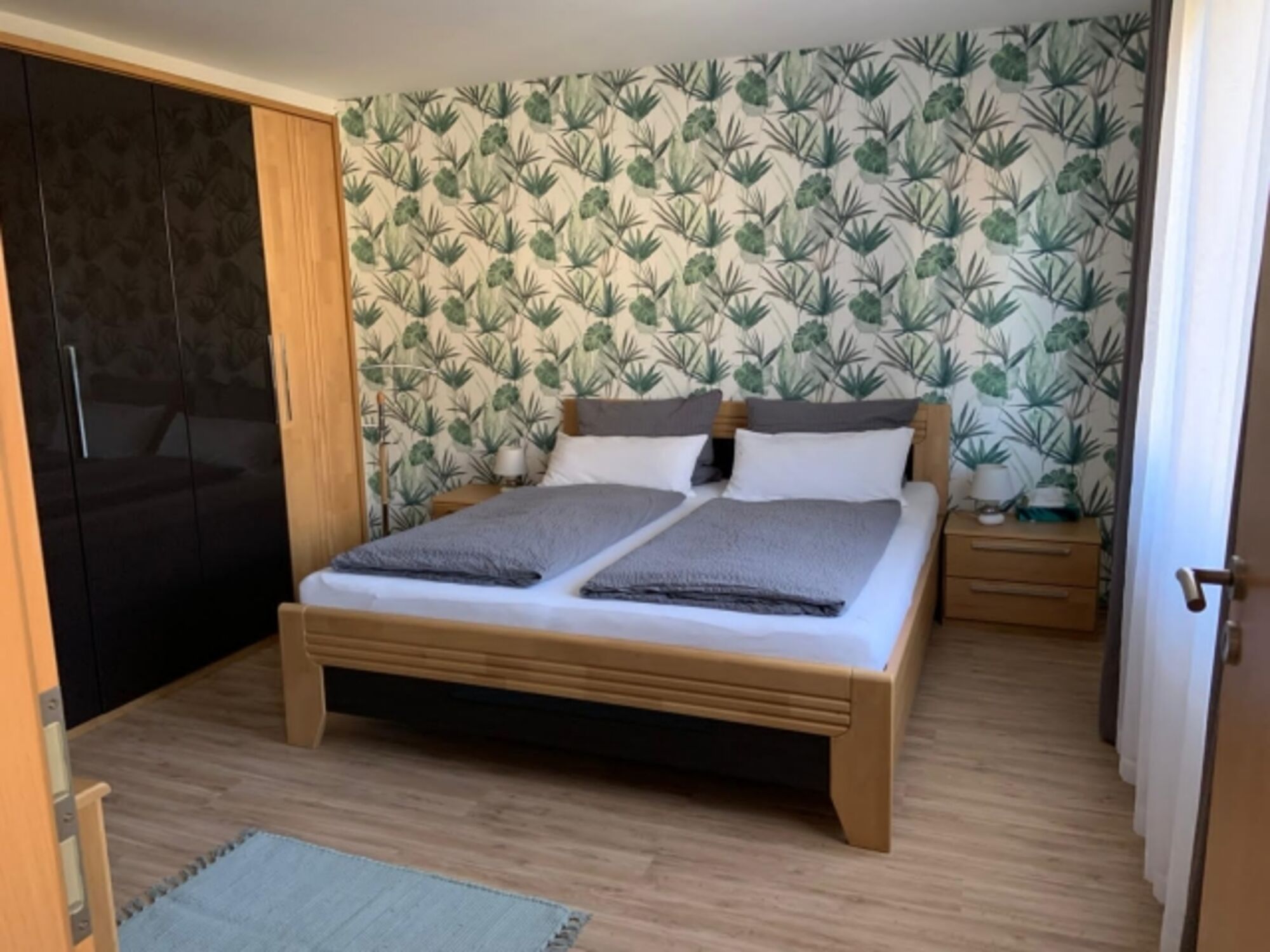 Doppelbett 2,00 x 2,00m, Kommode, Wecker, Spiegel, Leselampe am Bett