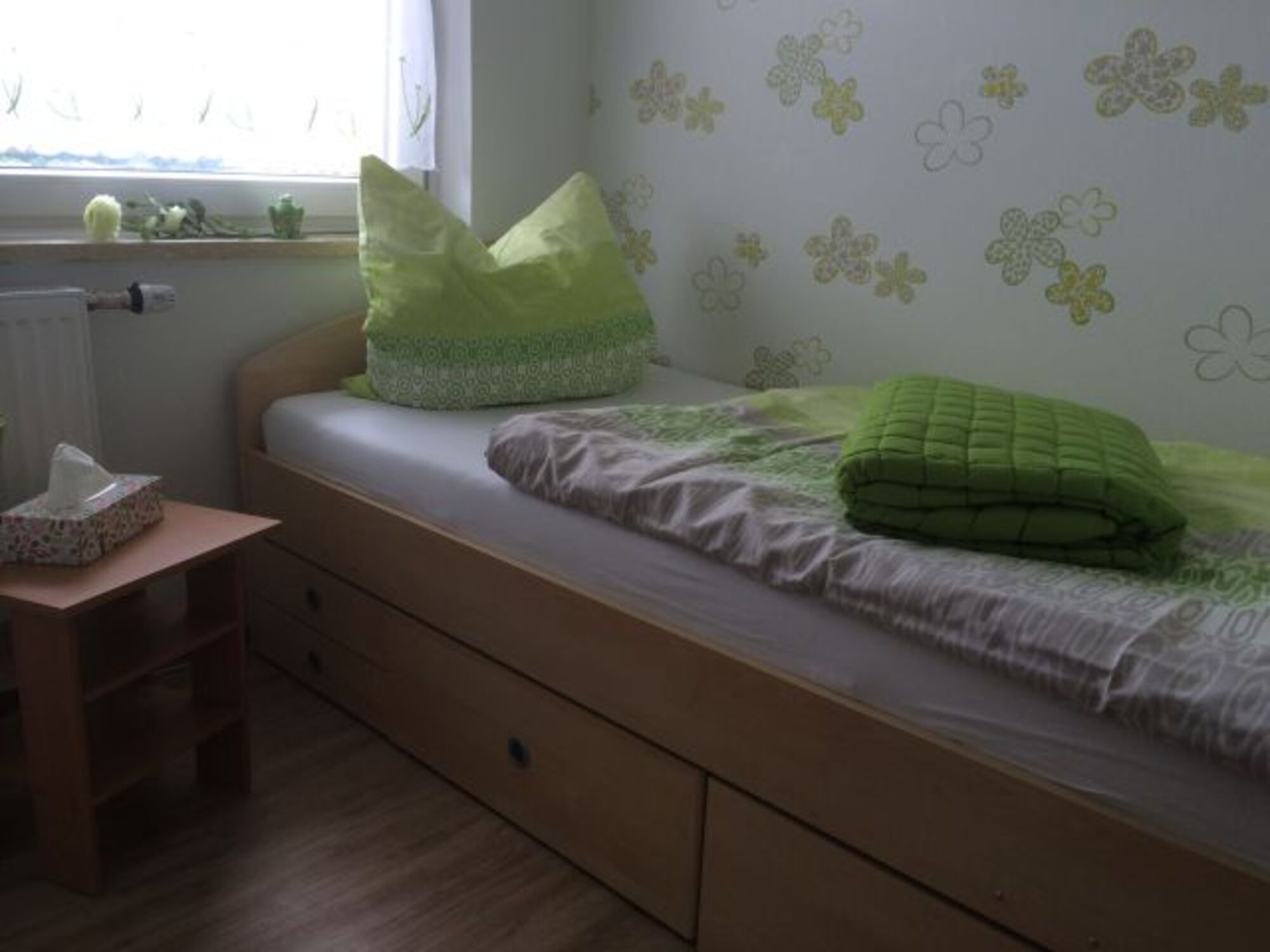 Dieses Schlafzimmer ist ein Durchgangszimmer zum Doppelbettzimmer/Elternschlafzimmer mit Arbeitsplatz Kommode, Leselampe am Bett