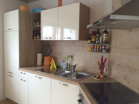 4-Platten Herd, Cerankochfeld, Dunstabzugshaube, Kühlschrank mit Gefrierfach, Gefrierschrank, Senseo-Kaffeeautomat, Eierkocher, Mixer, Korkenzieher / Flaschenöffner, Gewürze (Salz, Pfeffer, Zucker), Öl / Essig, Geschirrhandtücher, Mülltüten, Essplatz in der Küche