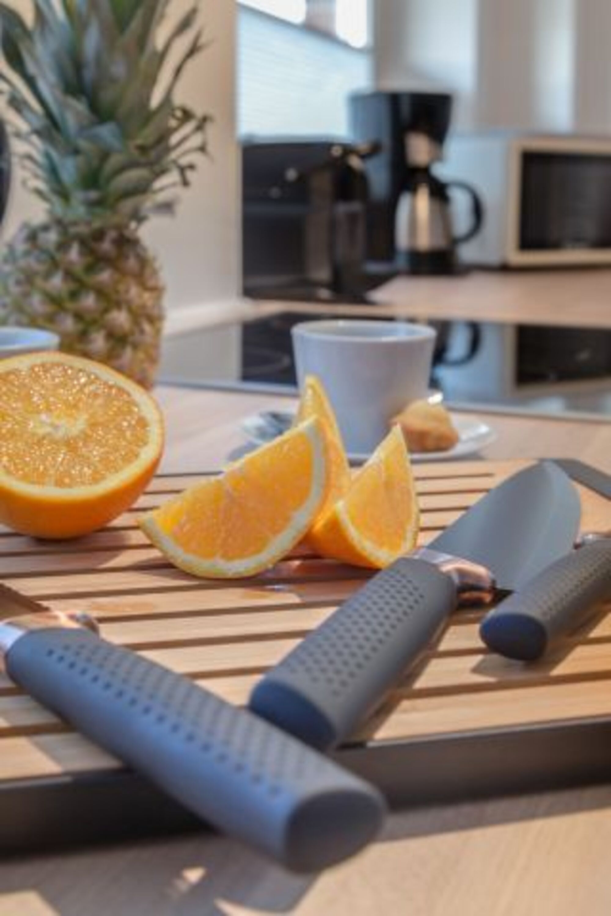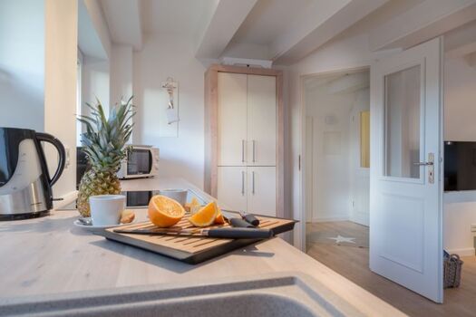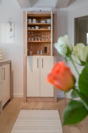 Im lichtdurchfluteten Wohn- und Essbereich erwartet Sie eine gemütliche Sofaecke für entspannte Abende sowie moderne Technik für Ihre Unterhaltung. Die offene, hochwertig ausgestattete Küche lässt keine Wünsche offen und lädt dazu ein, gemeinsam köstliche Urlaubsmahlzeiten zuzubereiten – ob ein ausgedehntes Frühstück oder ein gemütliches Dinner nach einem Tag am Meer.