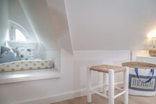 Das Schlafzimmer bietet mit einem großen Doppelbett und einer liebevoll gestalteten kleinen Schlafkoje einen ganz besonderen Rückzugsort – ideal für ein Kind bis ca. 1,20 m Körpergröße. Im stilvollen Badezimmer mit Badewannen-Dusch-Kombination können Sie den Tag entspannt ausklingen lassen und sich auf neue Inseltage freuen.