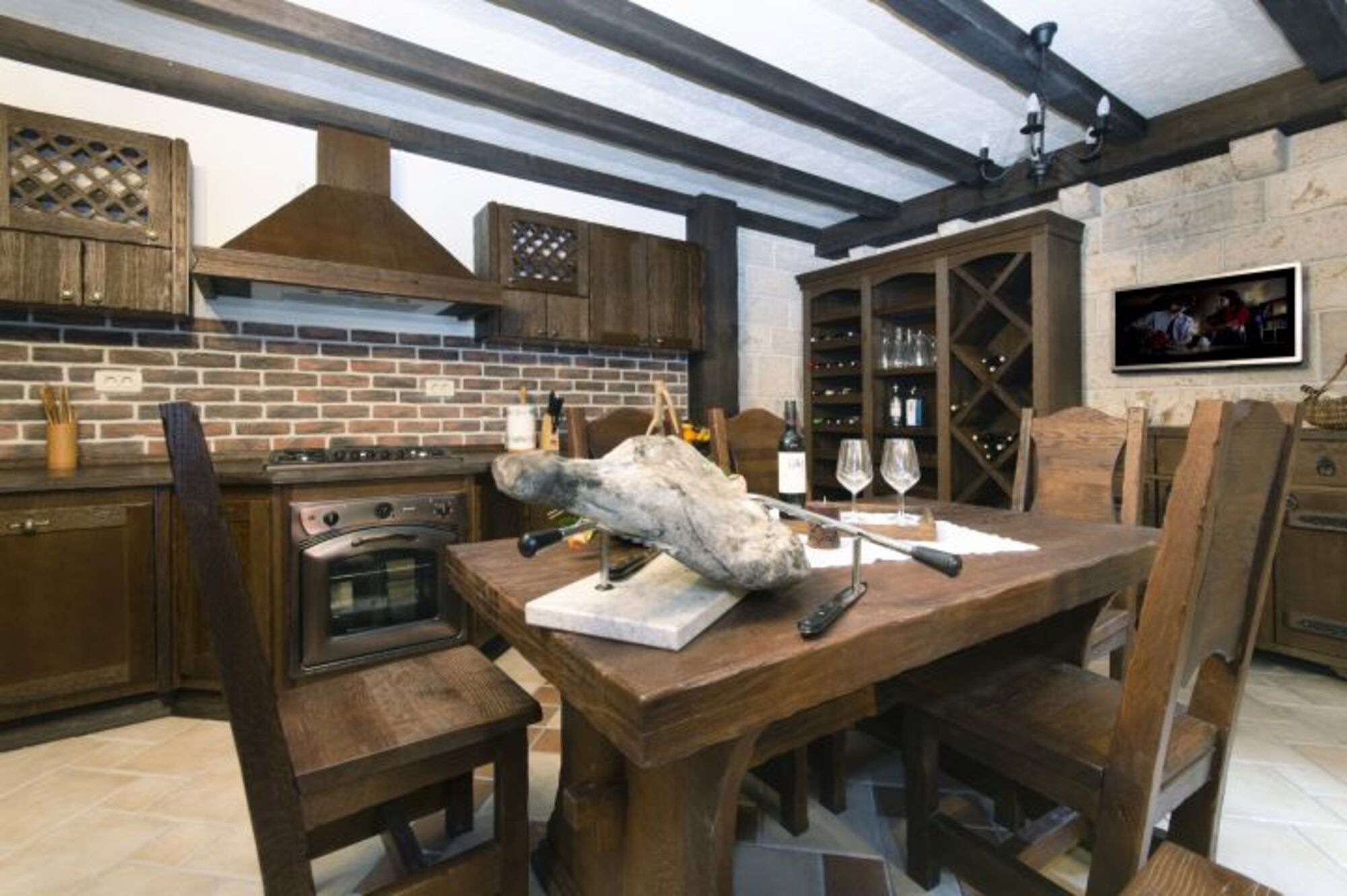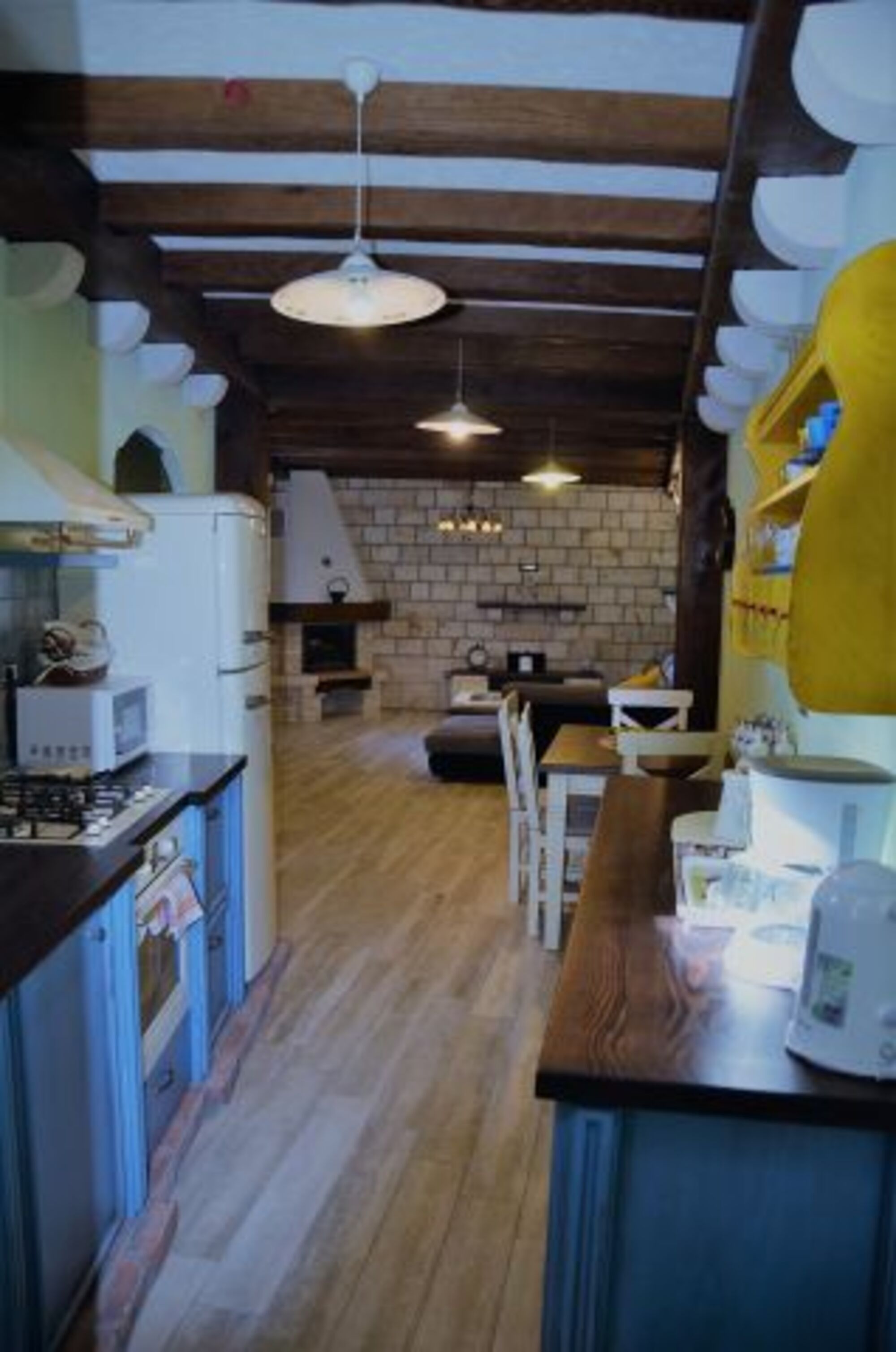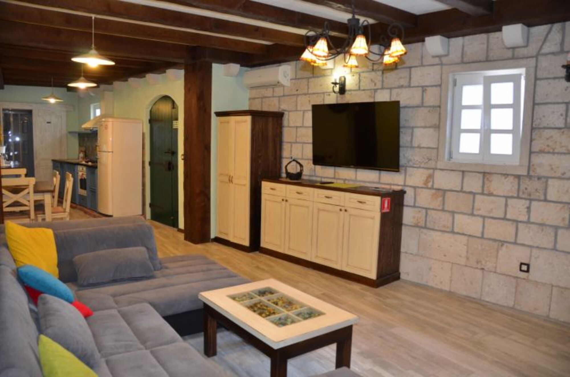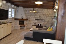 Im Erdgeschoss des Hauses befindet sich ein geräumiger Wohnraum mit Kamin, eine voll ausgestattete Küche, Essbereich für 8 Personen, ein Badezimmer mit Dusche und WC, sowie der Ausgang auf die Terrasse.
