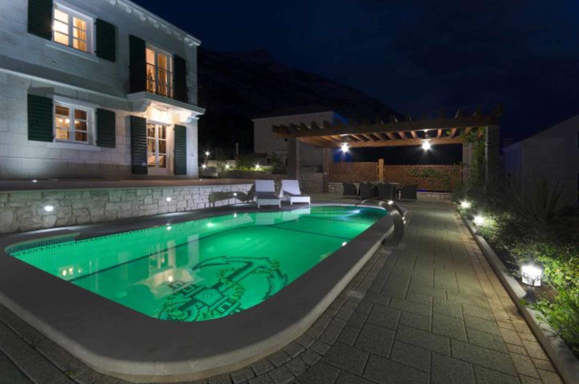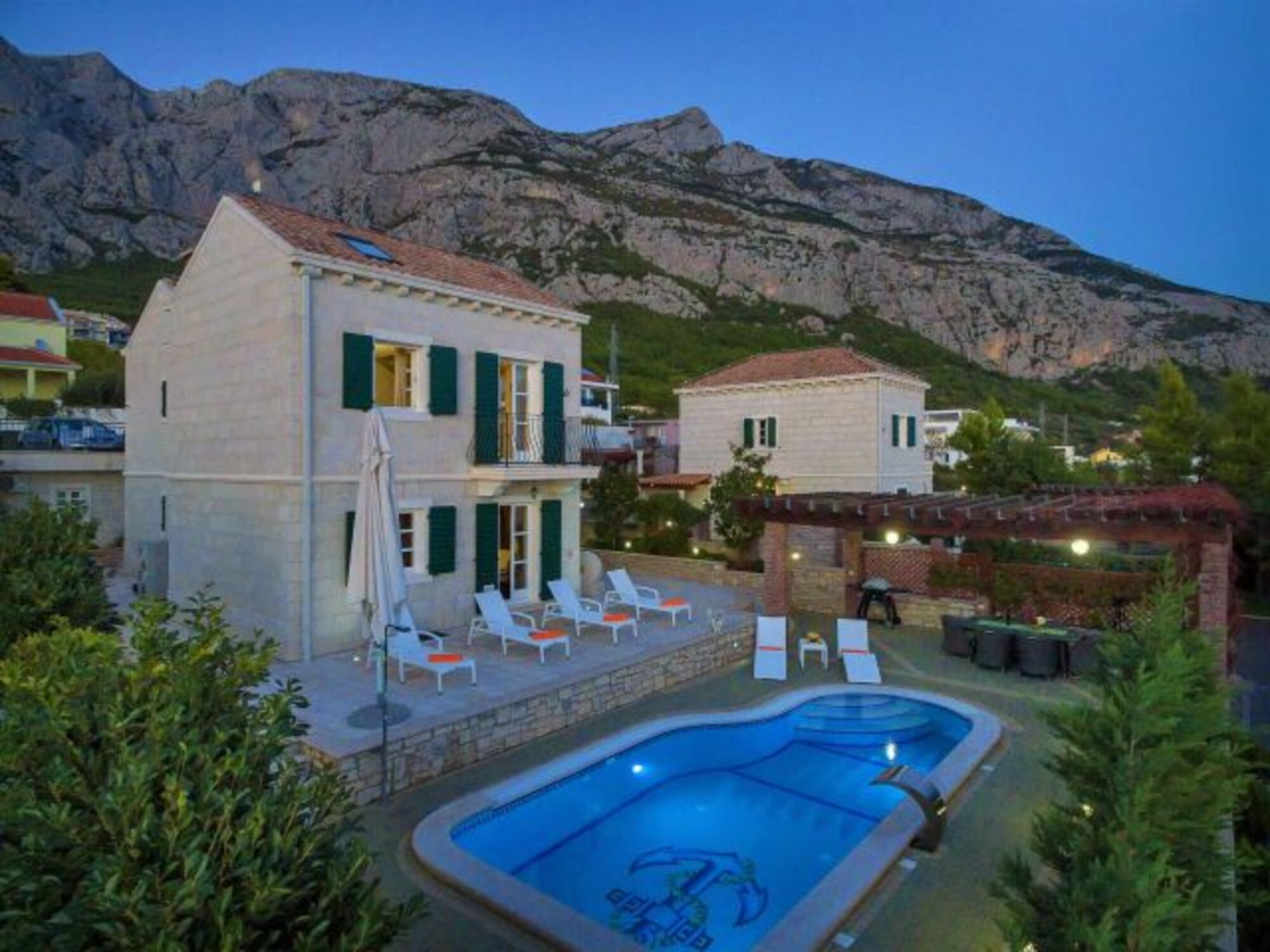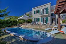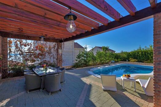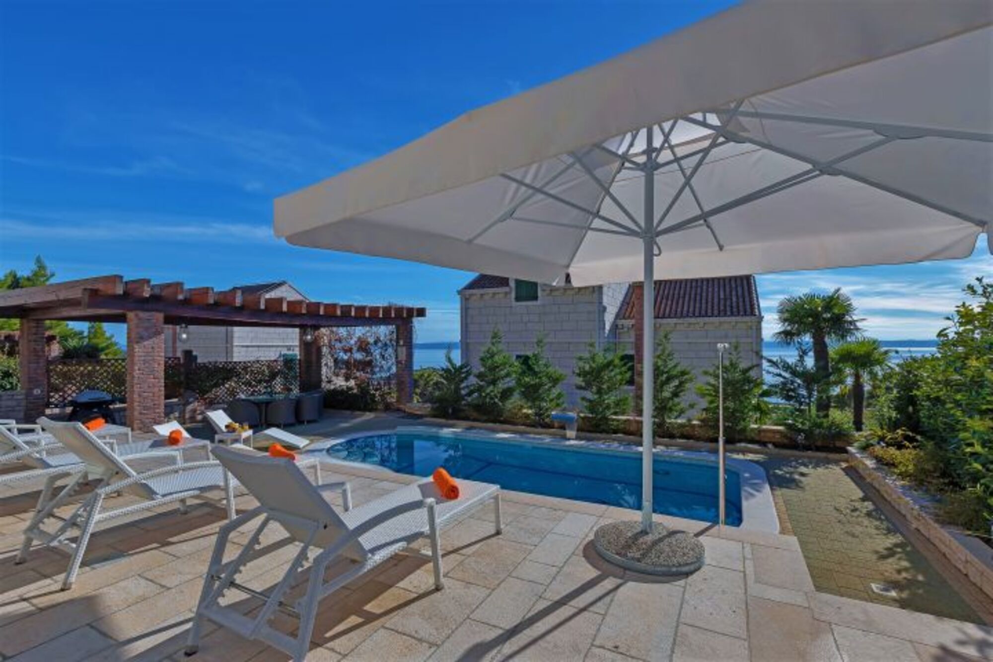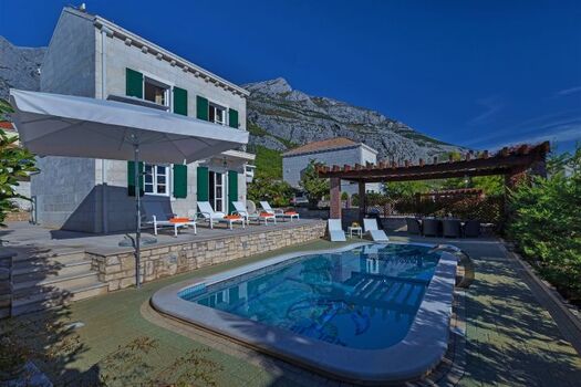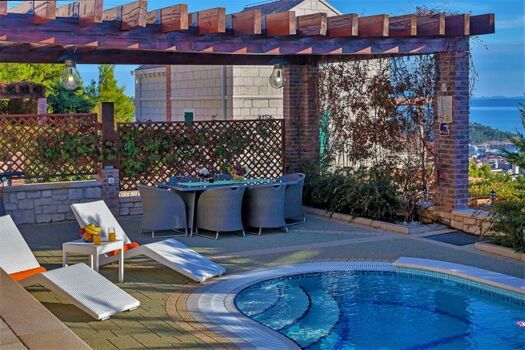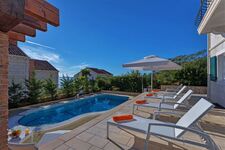 Die Villa hat eine große Terrasse mit privatem beheizbarem Pool von 24m², überdachten Sitzplatz und Grill, hochwertigen Gartenmöbeln, Liegen und Sonnenschirmen. Der Ausblick auf das Meer und die Inseln Brac und Hvar ist sehr schön, im Hintergrund ragt das Biokovo-Gebirge bis auf 1.762m hinauf.