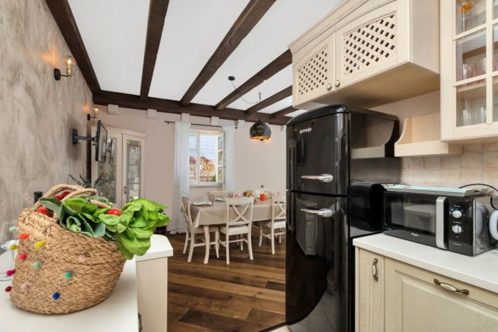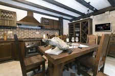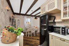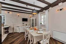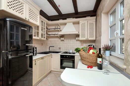 Cerankochfeld, Gasofen / Gasherd, Dunstabzugshaube, Kühlschrank mit Gefrierfach, Gefrierschrank, Mixer, Eismaschine, Korkenzieher / Flaschenöffner, Gewürze (Salz, Pfeffer, Zucker), Öl / Essig, Geschirrhandtücher, Mülltüten, Essplatz in der Küche, TV in der Küche