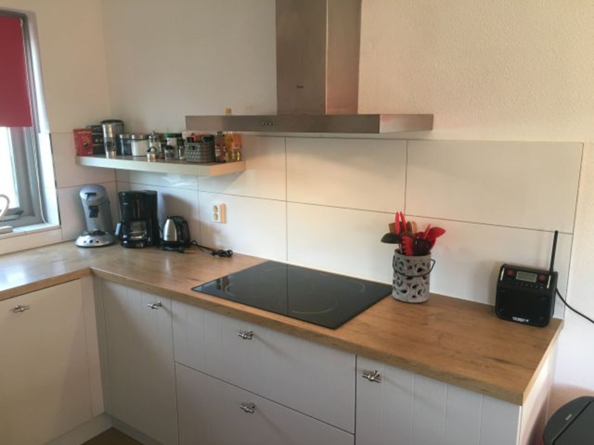 Induktionsherd, Dunstabzugshaube, Kühlschrank mit Gefrierfach, Gefrierschrank, Senseo-Kaffeeautomat, Eierkocher, Waffeleisen, Korkenzieher / Flaschenöffner, Gewürze (Salz, Pfeffer, Zucker)