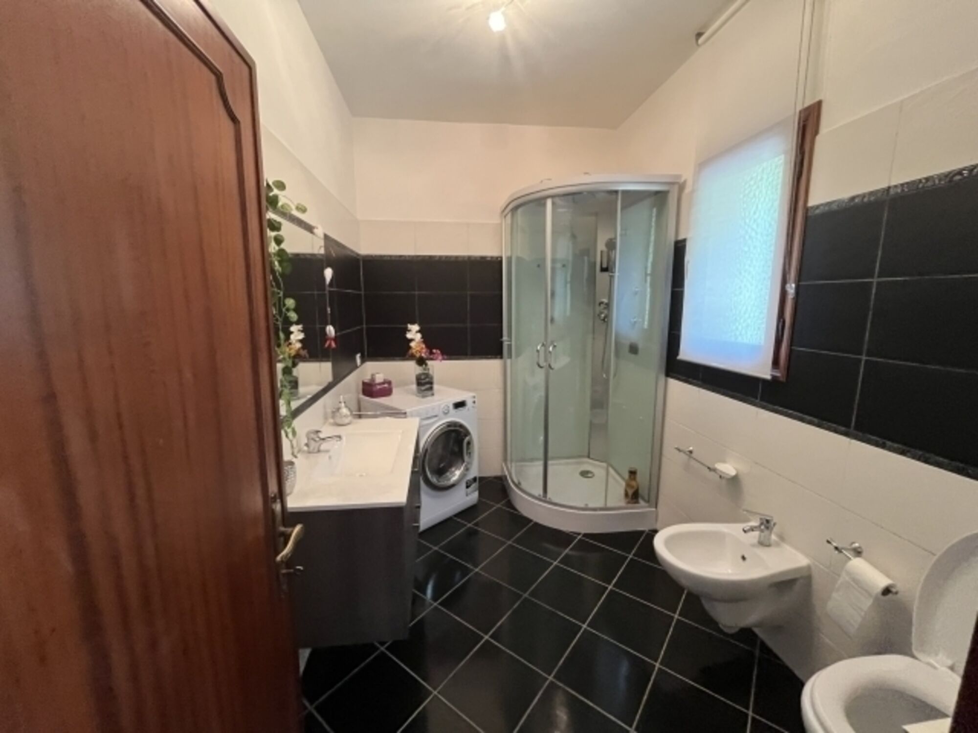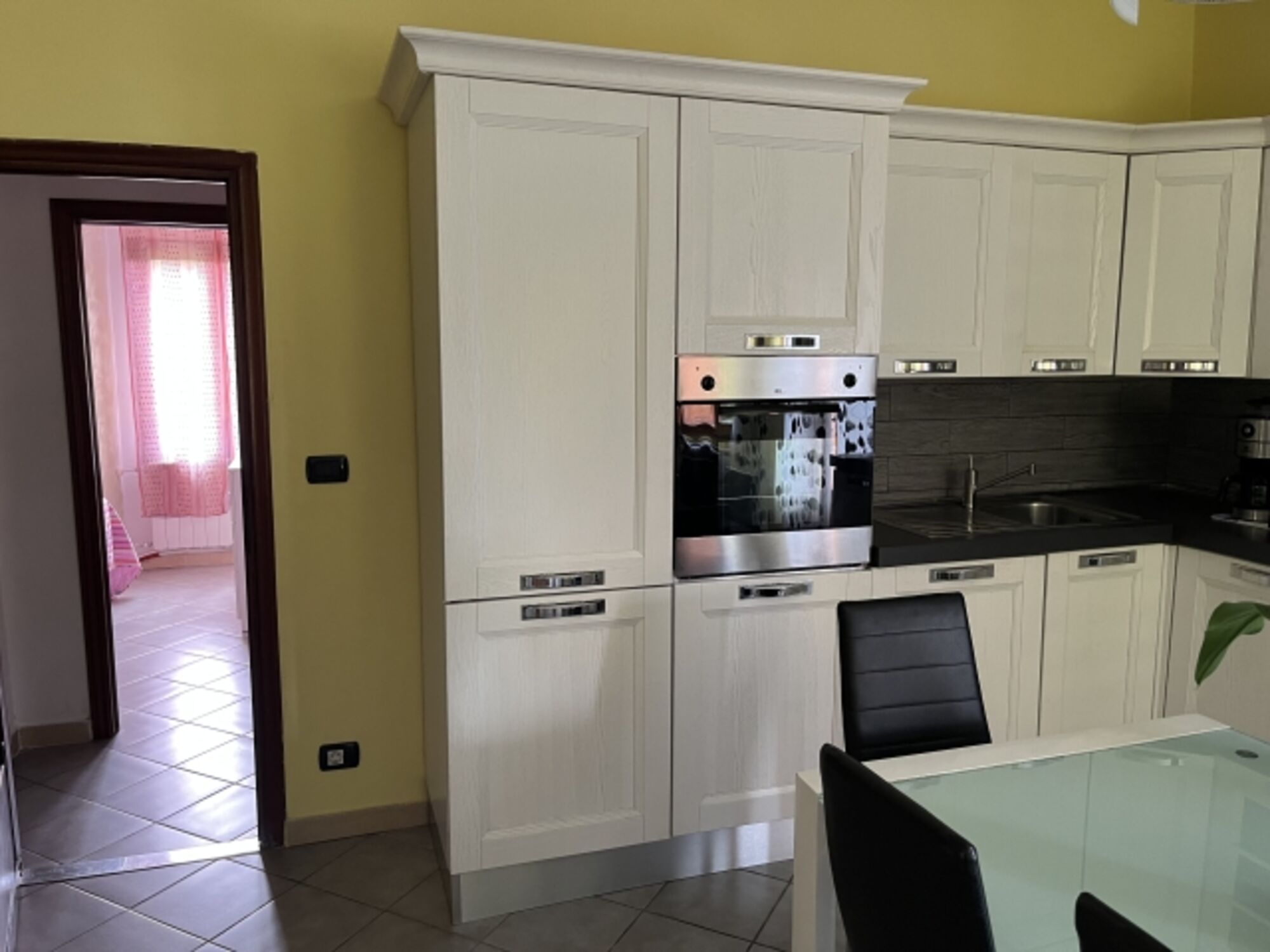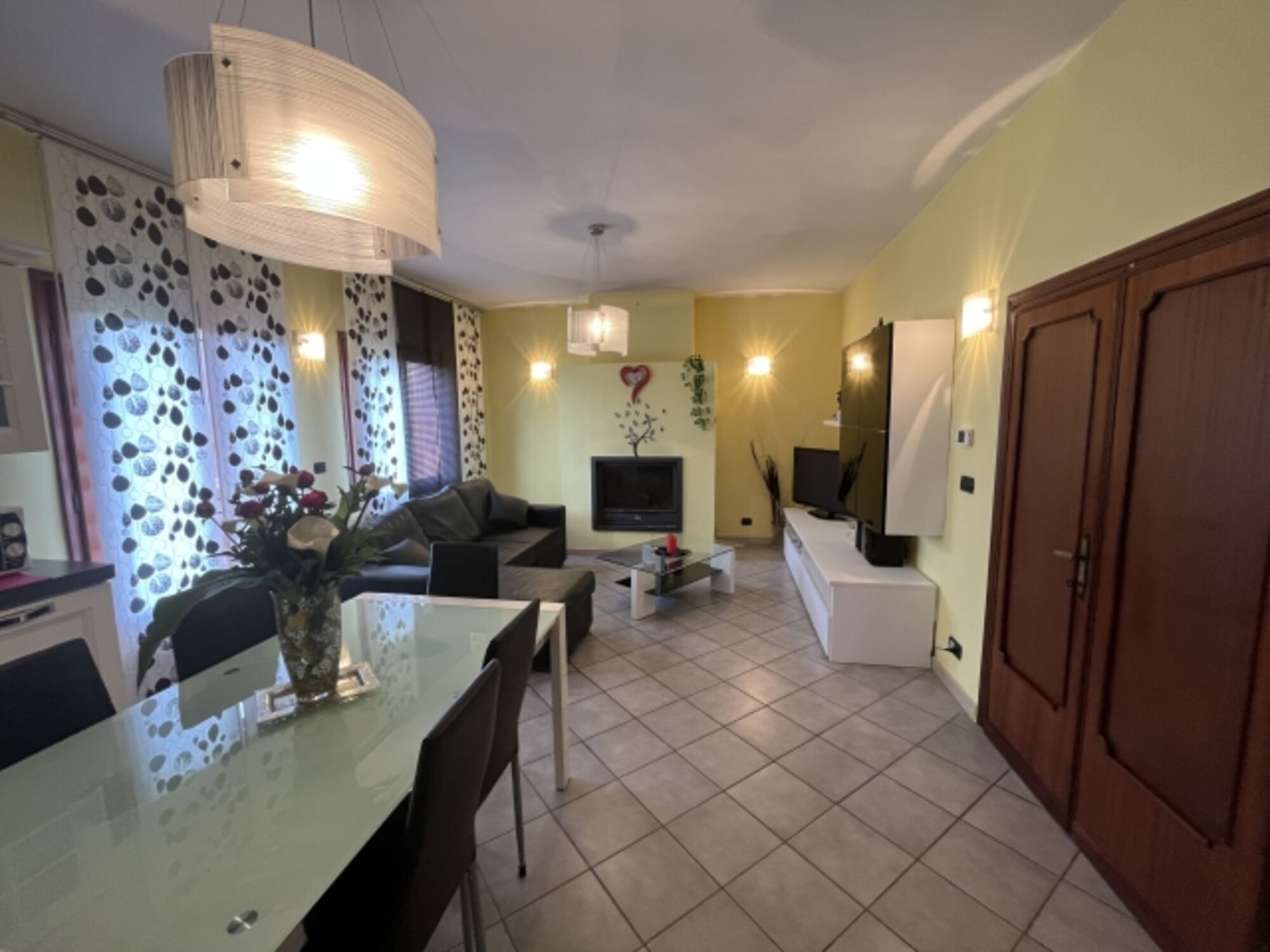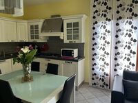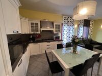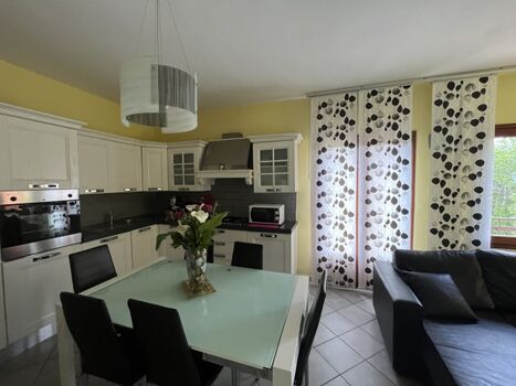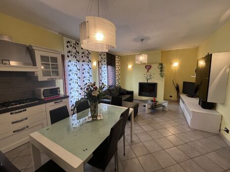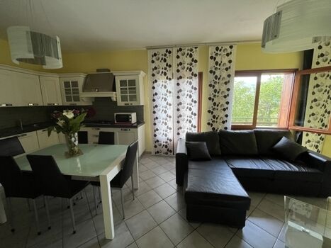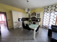 Grosse Wohnküche gut ausgestattet mit Herd, Mikrowelle, Kühl-Gefrierschrank, Geschirrspüler, Wohnzimmer mit Sofa Kamin, Tv, , 2 Fenstertüren mit Ausgang auf die Terrasse, 2 Doppelbettzimmer, 1 Einzelbettzimmer mit 1 zusätzlichem Ausziehbett, 1 Badezimmer mit Dusche, WC, Bidet, Waschmaschine
