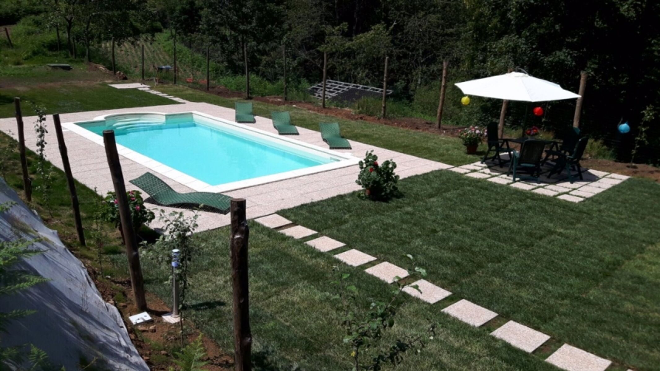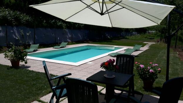 Das Haus ist eingezäunt und hat eine grosse Rasenfläche und ist geschmackvoll mit einem Schwimmbad mit Sonnenschirm und Liegestühlen ausgestattet.