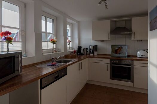 Auch die Küche ist mit Ceran-Kochfeld, Backofen, Kühl-/Gefrierkombi, Spülmaschine, Kapsel- und normale Kaffeemaschine, diverse Tees, Besteck und Geschirr komplett ausgestattet.