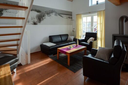 TV-Sat, Sky, TV-Flachbildschirm, Blu-Ray-Player, DVD bzw. Blu-Ray-Filme, CD-Player, CD´s, Bücher, Kaminofen, 3er-Sofa, Sessel