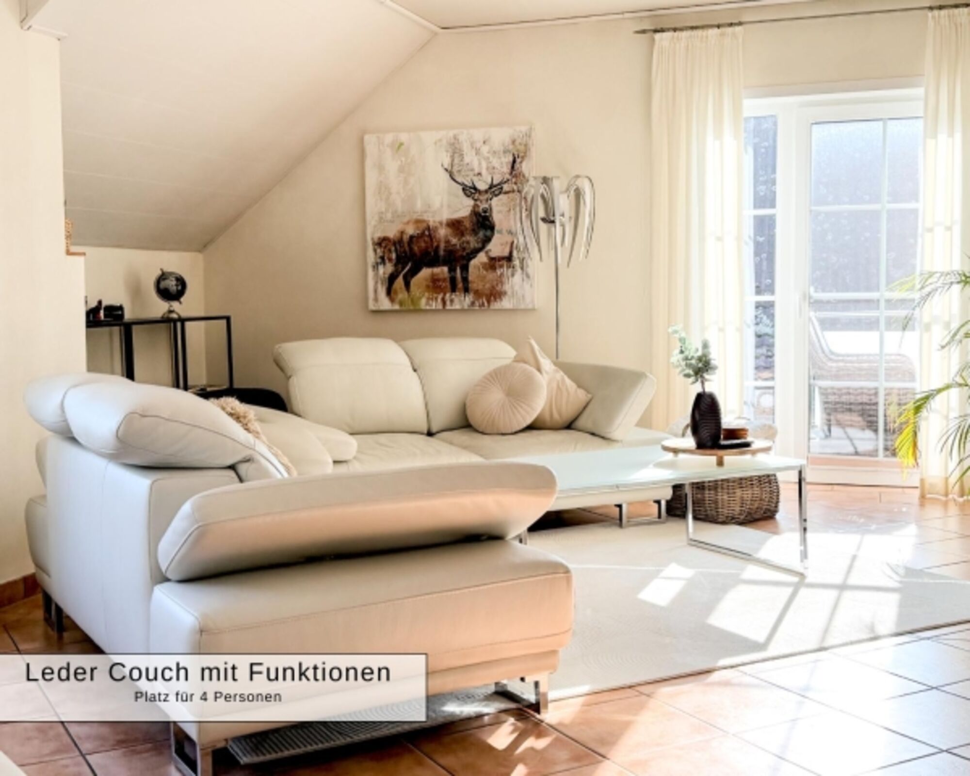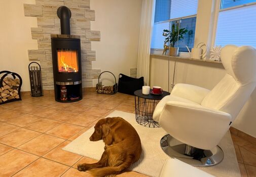 Nach dem Spaziergang lädt der großzügige Wohnbereich mit Fußbodenheizung und pflegeleichtem Fliesenboden zum Entspannen ein. Ein prasselndes Kaminfeuer, eine bequeme Ledercouch und dein Hund zufrieden daneben, so fühlt sich Urlaub an.