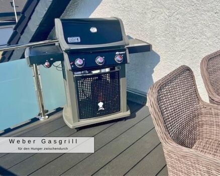 Cerankochfeld, Kühlschrank mit Gefrierfach, Kaffeevollautomat, Küchenmaschine, Mixer, Elekt. Fruchtpresse, Waffeleisen, Korkenzieher / Flaschenöffner, Gewürze (Salz, Pfeffer, Zucker), Öl / Essig, Geschirrhandtücher, Mülltüten, Essplatz in der Küche