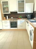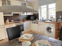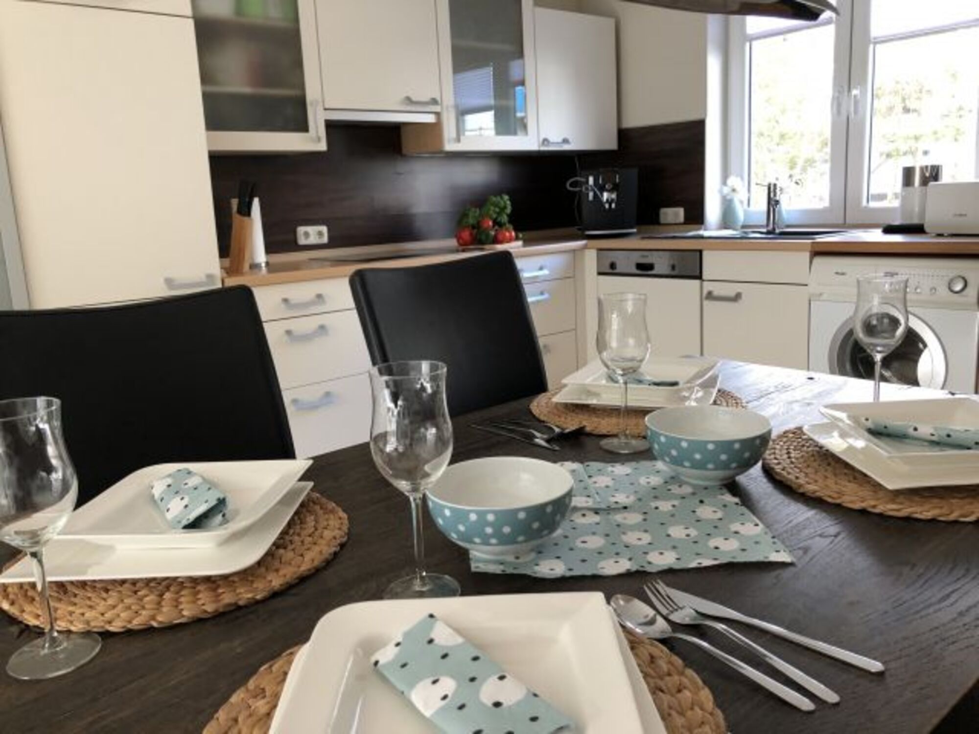 Cerankochfeld, Dunstabzugshaube, Kühlschrank mit Gefrierfach, Kaffeevollautomat, Mixer, Waffeleisen, Korkenzieher / Flaschenöffner, Gewürze (Salz, Pfeffer, Zucker), Öl / Essig, Geschirrhandtücher, Mülltüten, Essplatz in der Küche