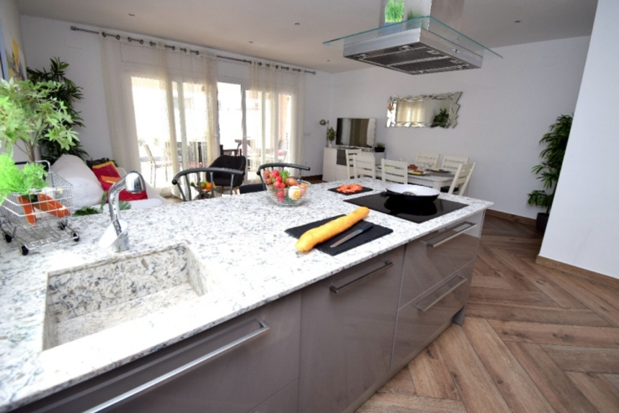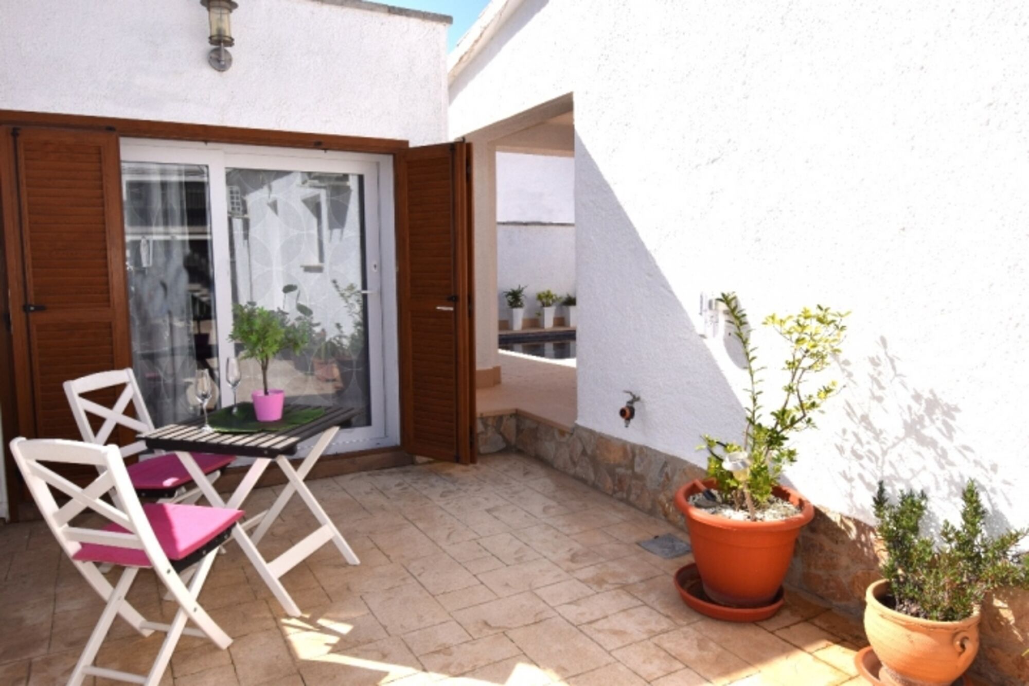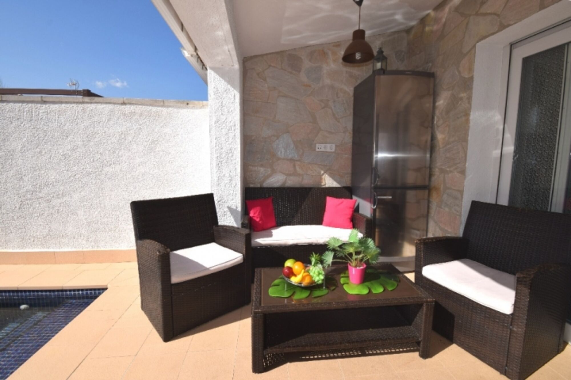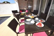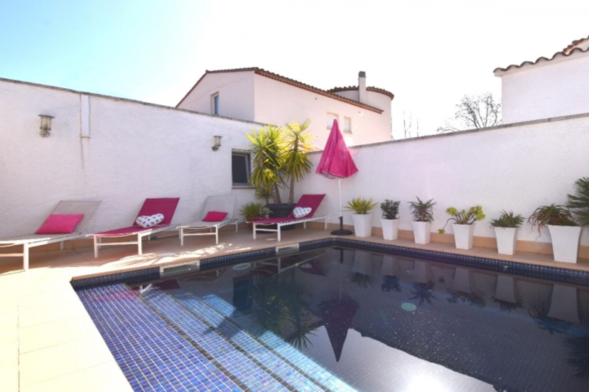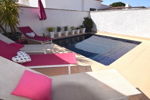 VILLA MONTSENY für 6 Personen befindet sich in zentraler, ruhiger Lage in der Strasse Montseny nur 400 m zum Alberes Center (mit Supermarkt, Bäckerei, Kaffees, Restaurants, Zeitungsladen etc.). Der Terrassenbereich und Swimmingpool mit römischer Treppe liegt windgeschützt zur Sonnenseite (Südseite) so dass Sie schon morgens auf der Terrasse frühstücken können. Sehr grosse teilüberdachte Terrasse mit Esstisch u. Stühlen sowie gemütlicher Lounge, Grill, Sonnenliegen und zusätzlichem Aussenkühlschrank. Komplett eingezäuntes Grundstück mit mind. 3 abgeschlossenen PKW –Stellplätzen.