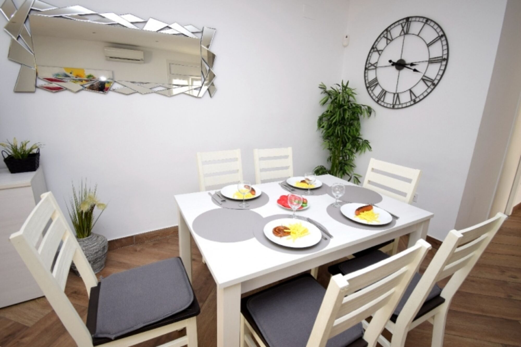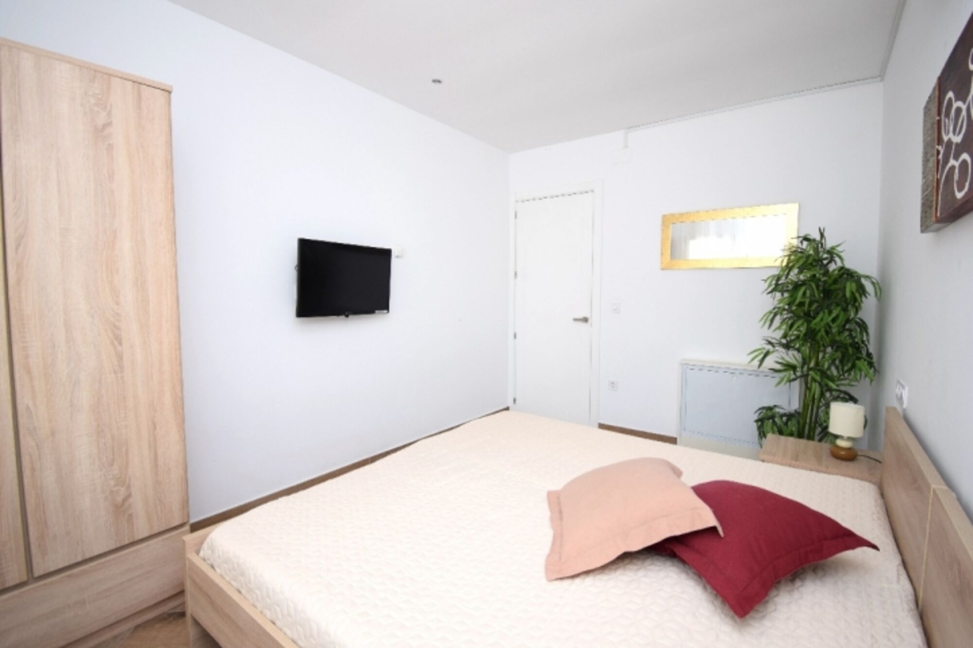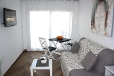 Klima, Doppelbett (160 x 200 cm), Kleiderschrank, SAT-TV mit Flachbildschirm, Tisch und Stühle, elektrischer Rollo.