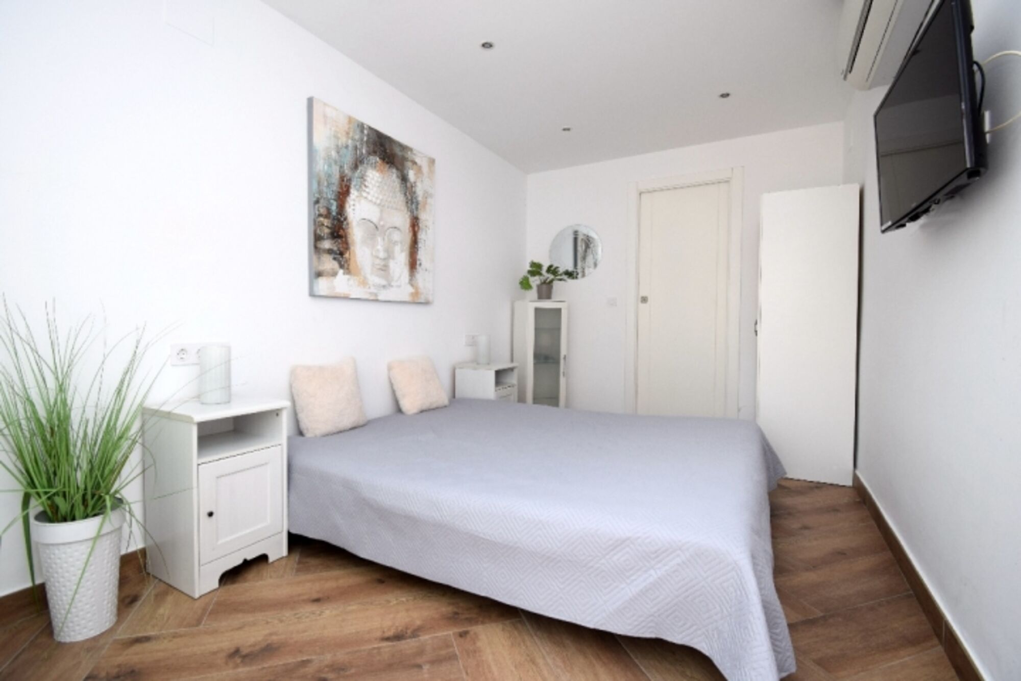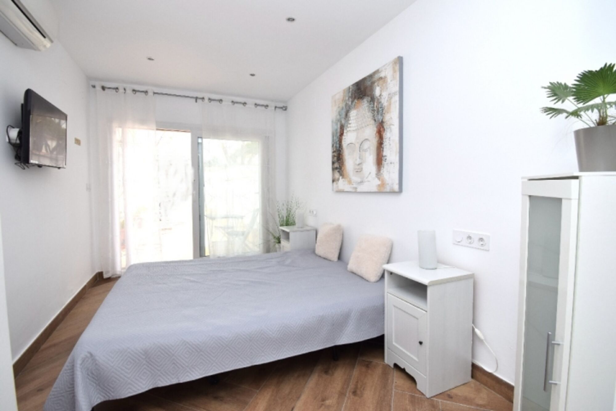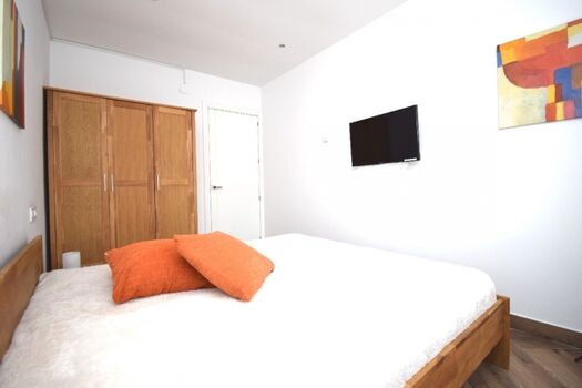 1 Schlafzimmer mit Doppelbett (2 Einzel-Gesundheitsmatratzen), Klima, Kleiderschrank, SAT-TV, elektrischer Rollo und Fliegengitter am Fenster.