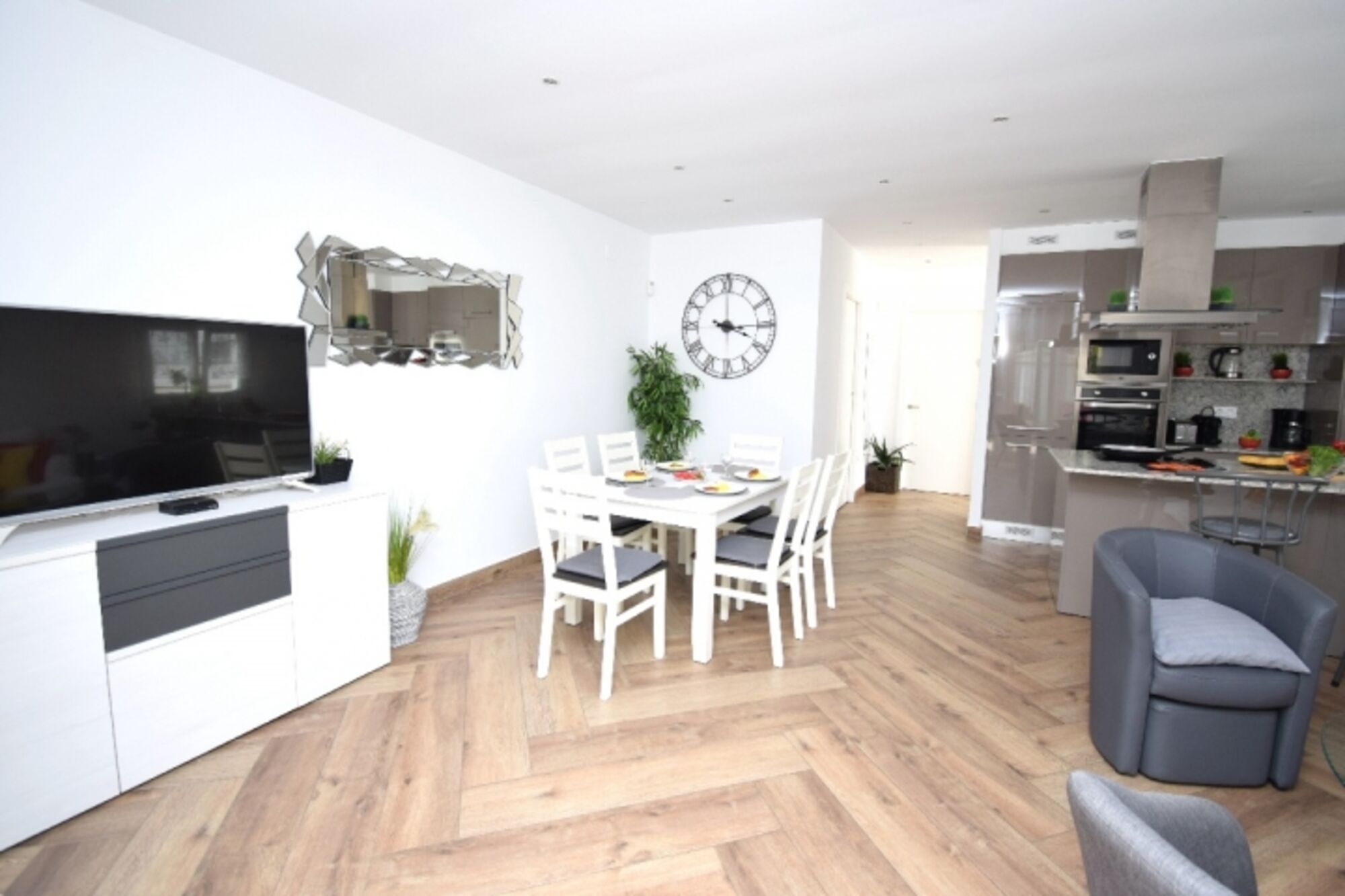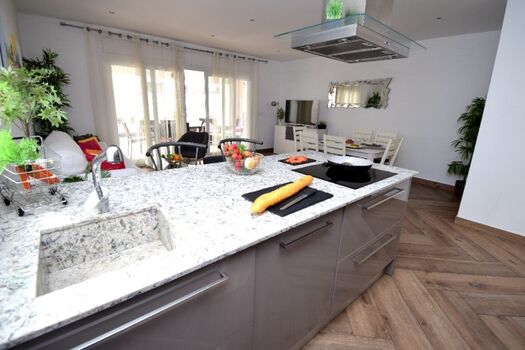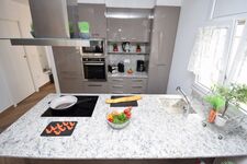 Modernste und komplett eingerichtete Einbauküche (Mikrowelle, Backofen, Kühl-Gefrierkombination, Ceranherd, Abzugshaube, Spülmaschine, 1 Filter-Kaffeemaschine und eine Kaffee-Kapselmaschine (NESPRESSO), Toaster, Wasserkocher und sämtliches Geschirr etc.)