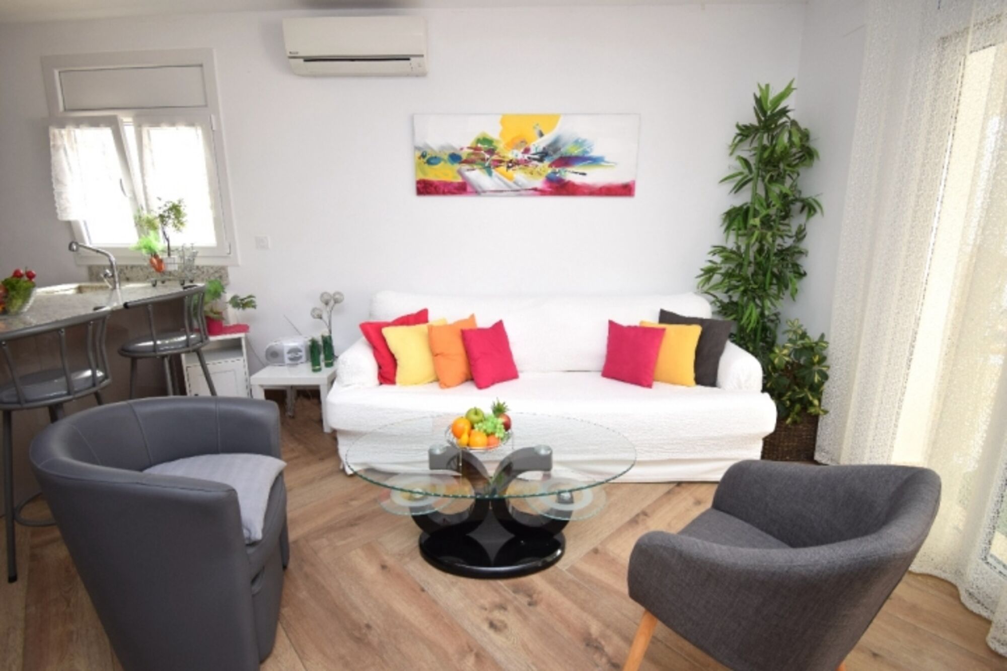 Klima, moderne grosse Couchgarnitur, SAT-TV mit grossem Flachbildschirm, Musikanlage.