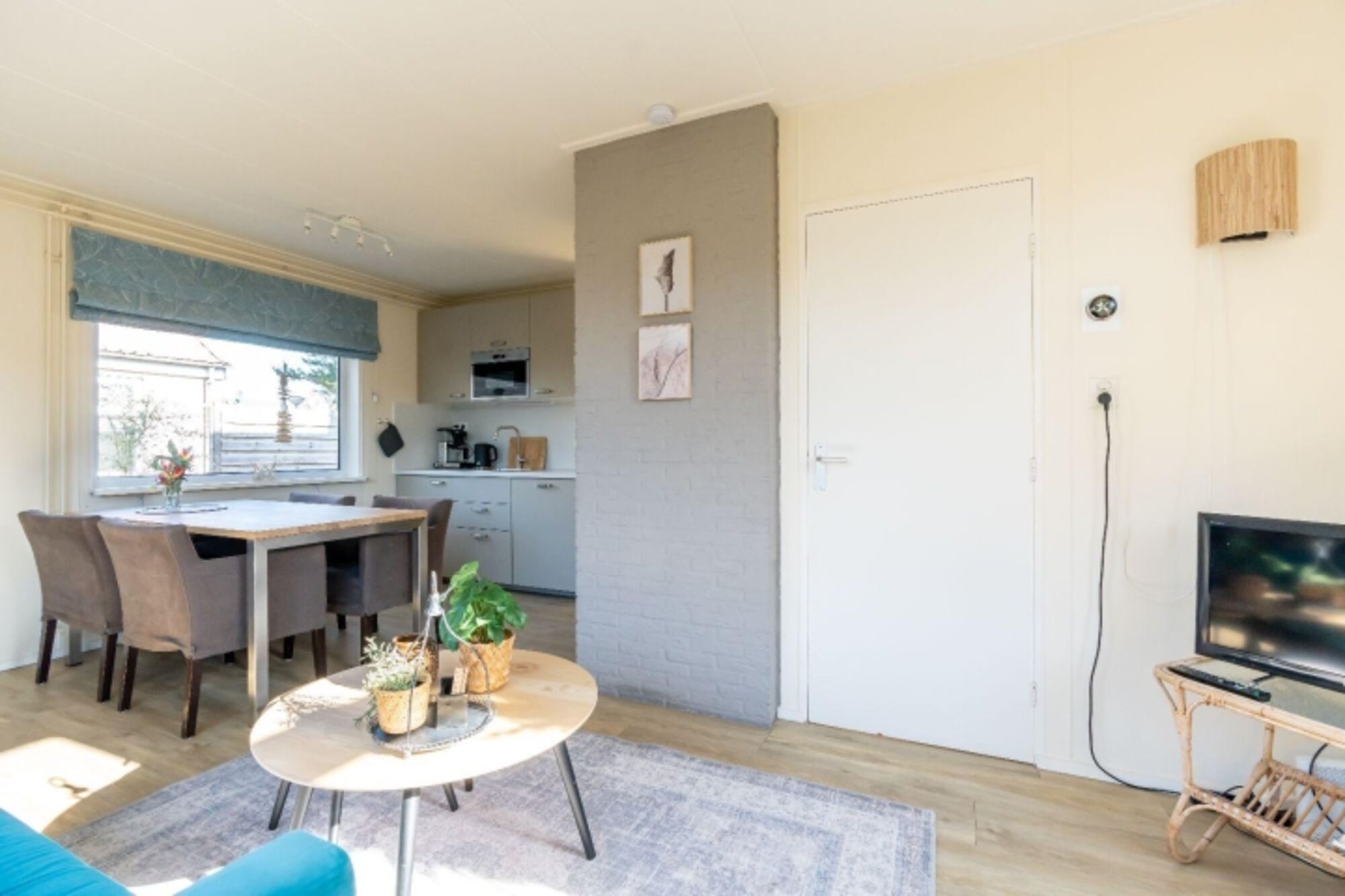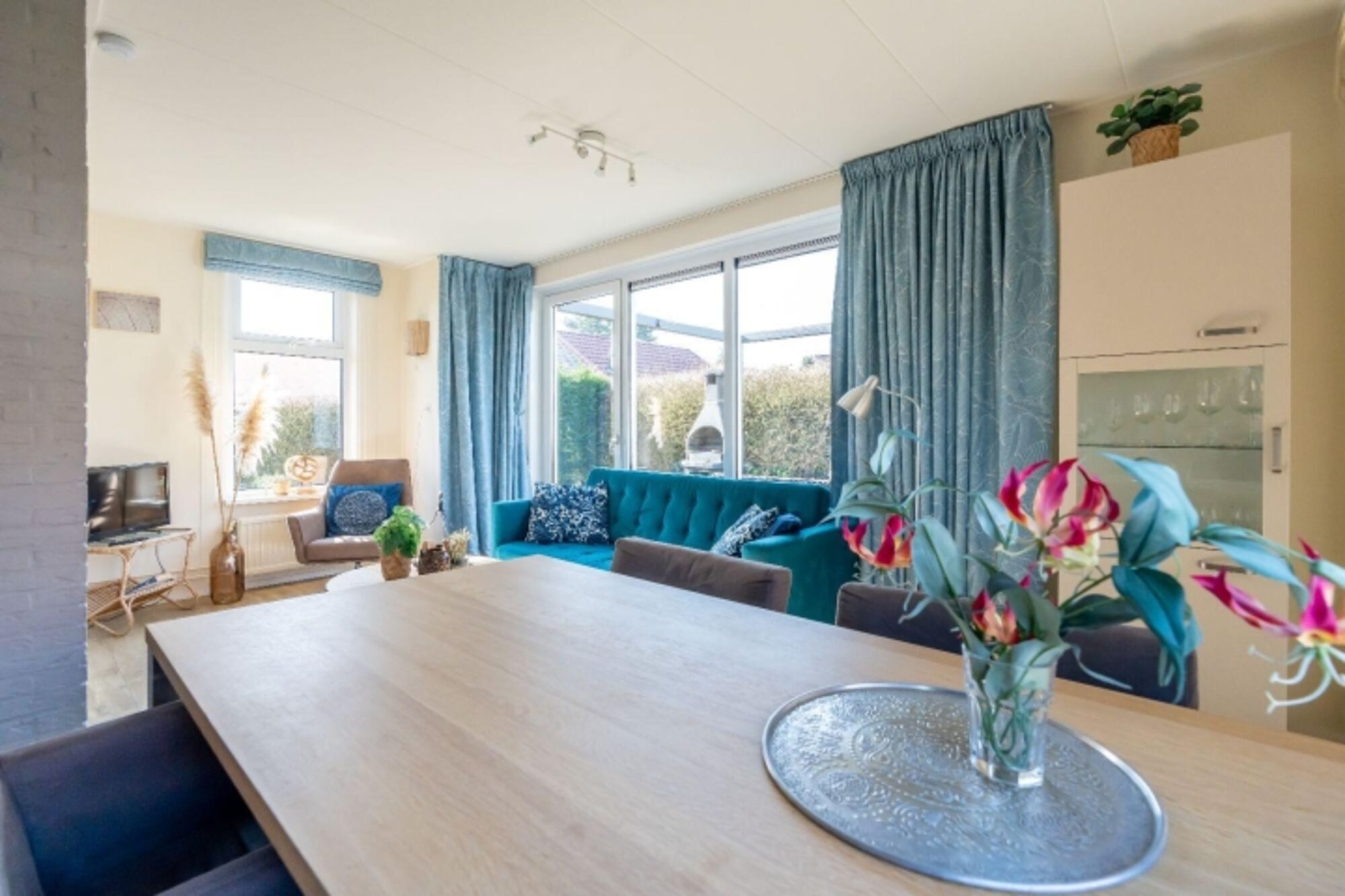 Durch den Flur gelangen Sie in das gemütlich eingerichtete, helle Wohnzimmer. Das Wohnzimmer hat eine Sitzecke mit Fernseher. Vom Wohnzimmer aus betreten Sie die sonnige Terrasse mit einer Gartengruppe für 4 Personen. Hier können Sie den Tag mit frischen Brötchen beginnen und mit einem guten Glas Wein und Grill abschließen. An das Haus ist eine Pergola mit Harmonika Schattentuch angebaut. Ideal für die sonnige, zeeländische Sommer.