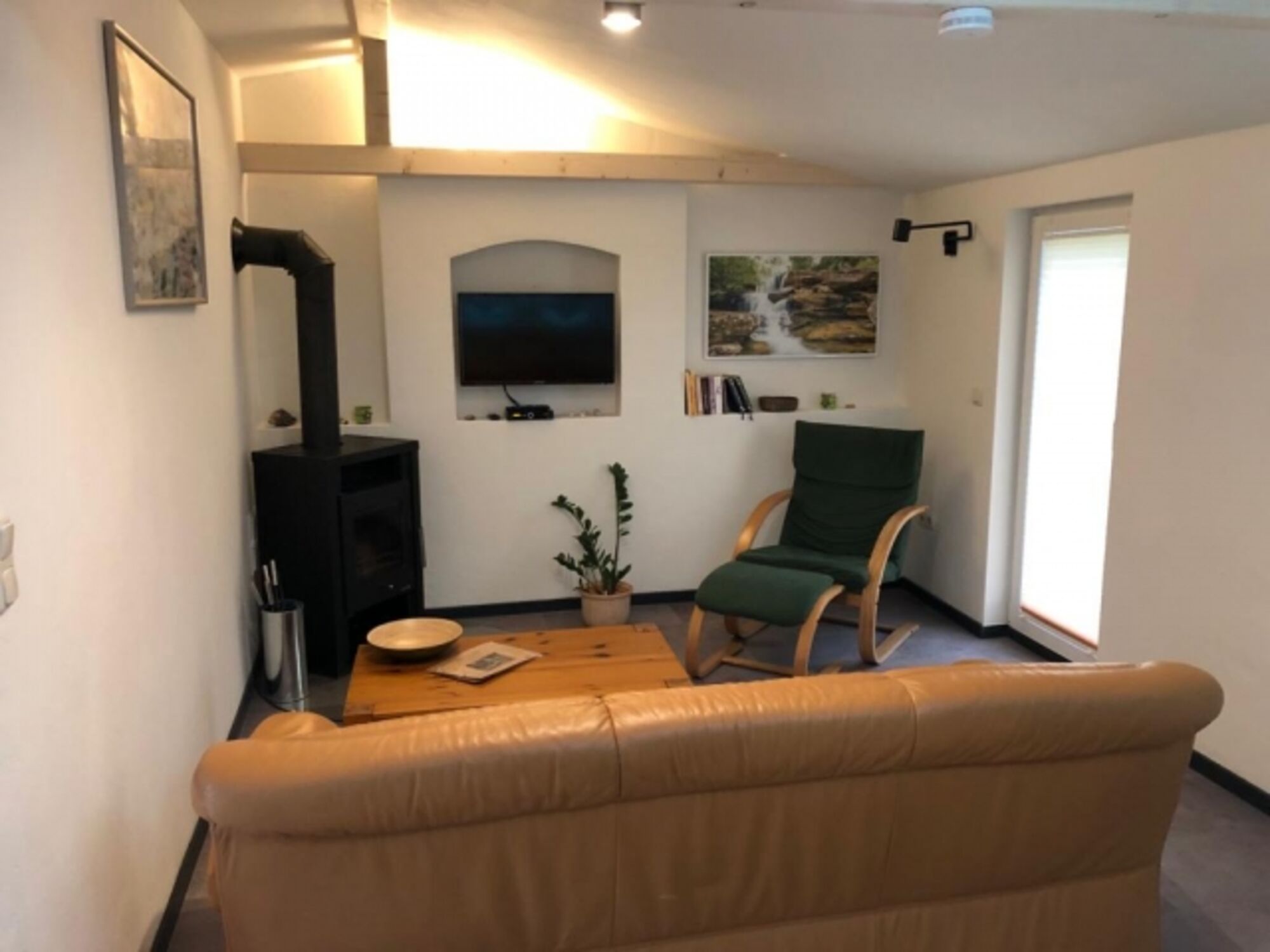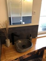 Die Wohnung Grasmücke ist im Winter 2020/21 komplett neu saniert worden. Highlight sind die sichtbaren Balken im Wohnbereich, das eigenhändig selbst gebaute Bett sowie das moderne Bad. Das Waschbecken aus Naturstein steht auf einem ebenfalls selbst gebauten Waschtisch aus einem Stamm aus unserer Heimat, dem Thüringer Wald.