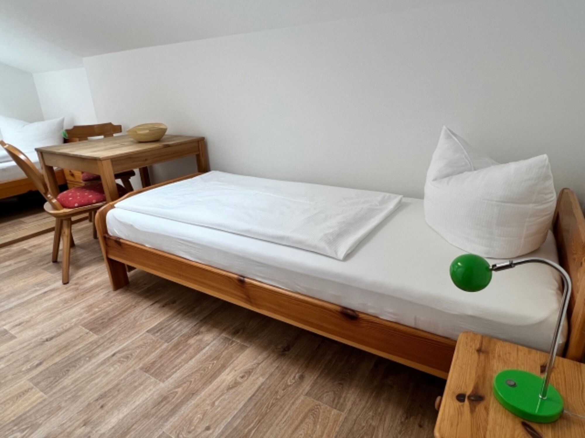 Einzelbett, Kommode, Leselampe am Bett