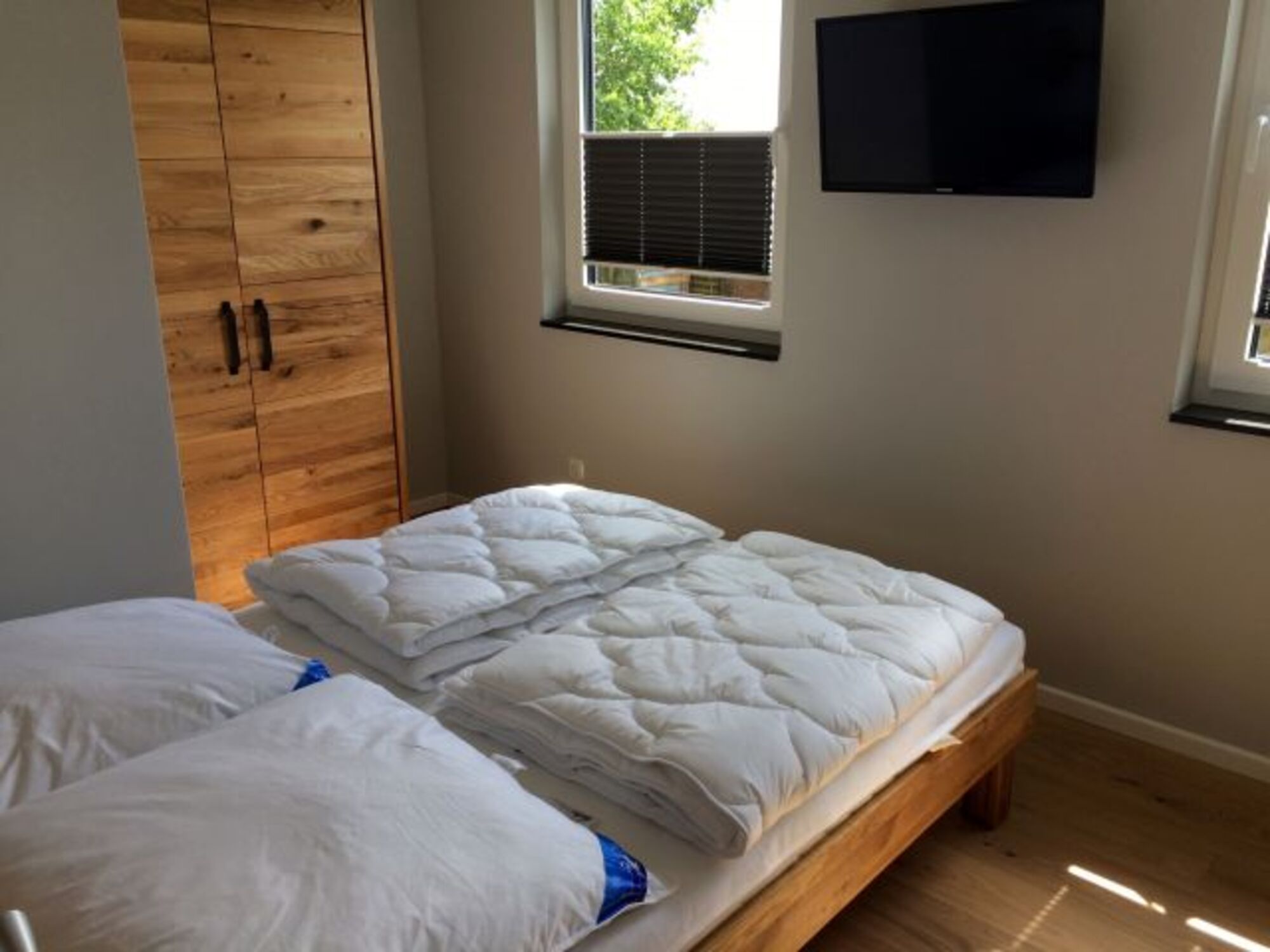 Im Erdgeschoss befinden sich die Schlafräume (beide mit Doppelbett und TV ausgestattet) und ein Duschbad.