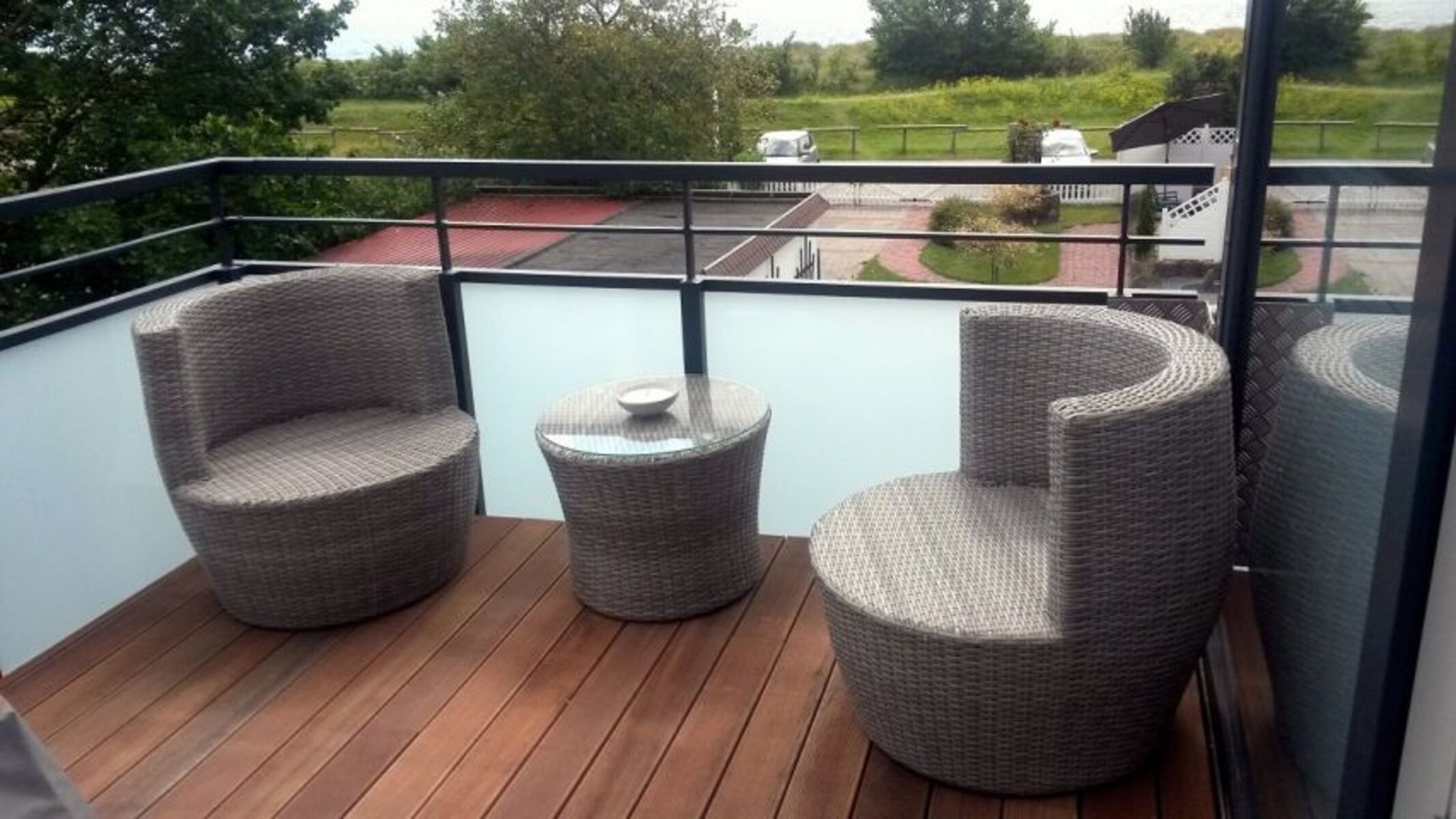 Auf dem Balkon befinden sich ein Strandkorb, eine Lounge-Garnitur und ein Weber Gasgrill.