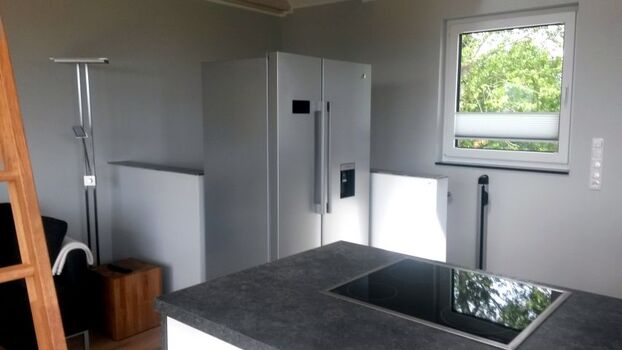 Im Obergeschoss ist der Wohn- und Essbereich, dieser verfügt über eine Küche mit Kochinsel und Amerikanischen Kühlschrank mit Eiswürfelherstellungs Funktion. Im Wohnbereich befindet sich ein Kaminofen.