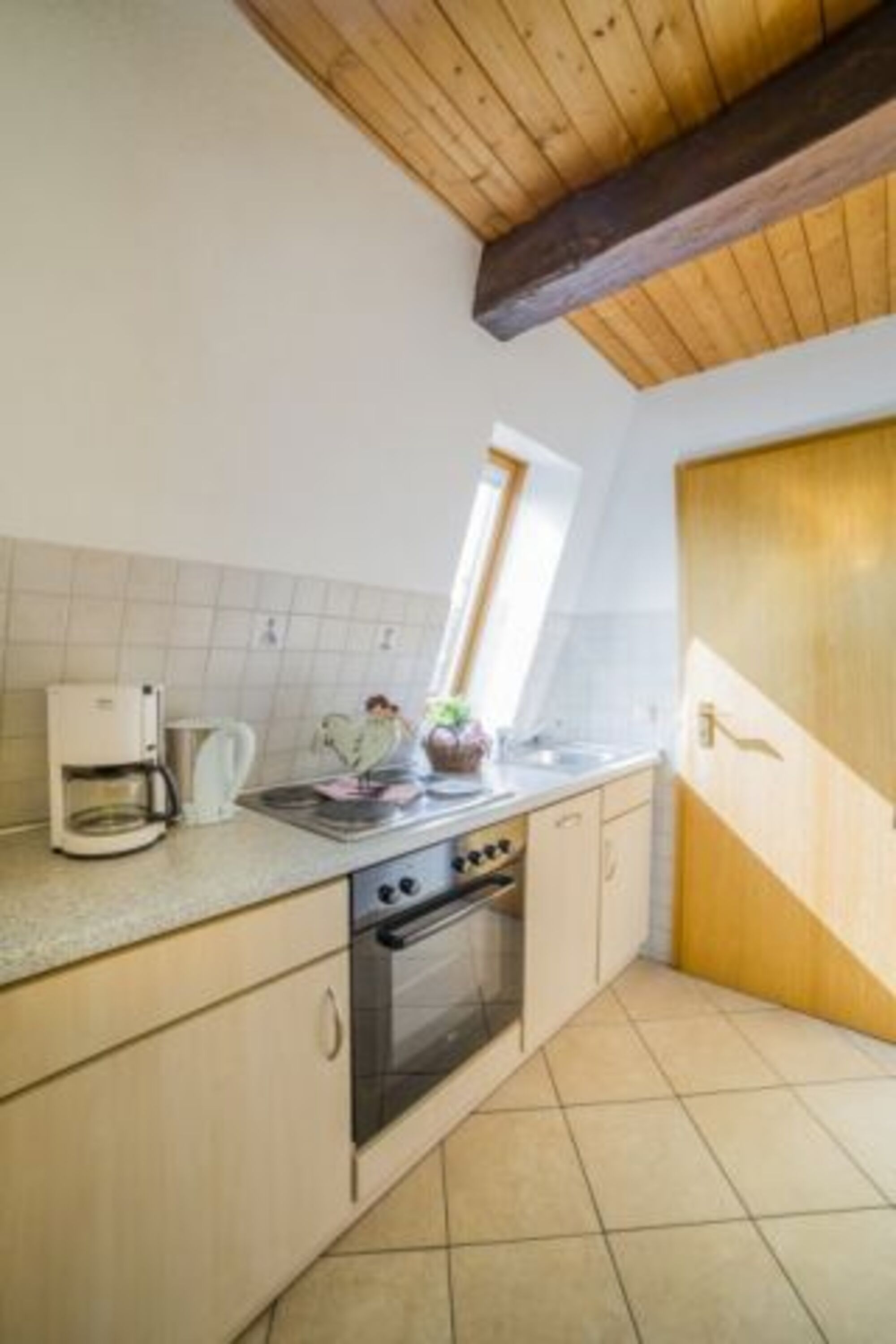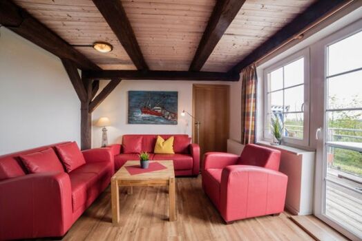 So macht es Spaß auf dem Land zu leben. Diese Ferienwohnung ist ein Ort, an dem man sich geborgen fühlt. Sie ist hochwertig eingerichtet und sehr gemütlich. Dicke und sichtbar alte Deckenbalken verbreiten rustikalen Charme. Möbel aus hellem Holz strahlen Gemütlichkeit aus. Bequeme Ledersessel laden zum Ausruhen ein. Ein Flachbild-Fernseher liefert die Unterhaltung dazu.