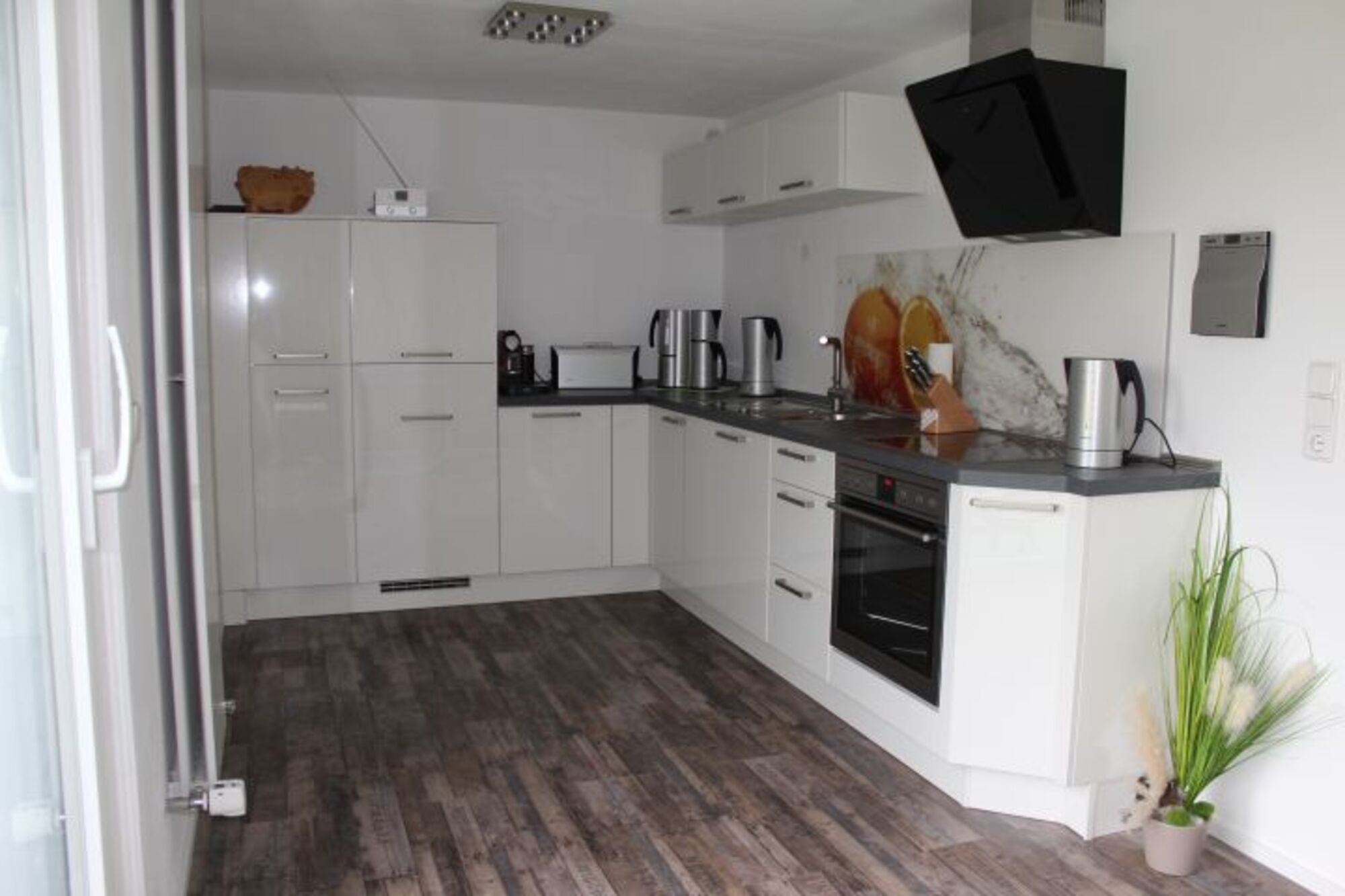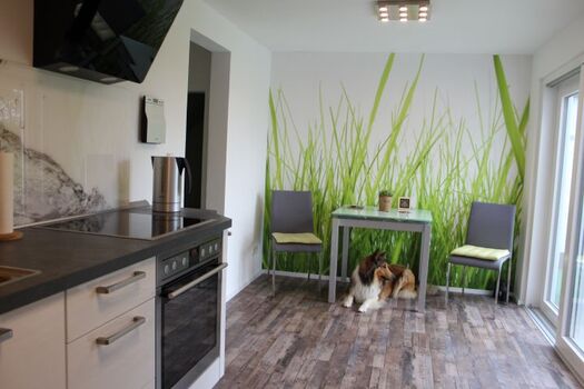 Induktionsherd, Dunstabzugshaube, Gefrierschrank, Nespresso-Automat, Mixer, Korkenzieher / Flaschenöffner, Geschirrhandtücher, Mülltüten, Essplatz in der Küche