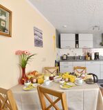 Cerankochfeld, Dunstabzugshaube, Kühlschrank mit Gefrierfach, Korkenzieher / Flaschenöffner, Gewürze (Salz, Pfeffer, Zucker), Öl / Essig, Geschirrhandtücher, Mülltüten, Essplatz in der Küche, TV in der Küche