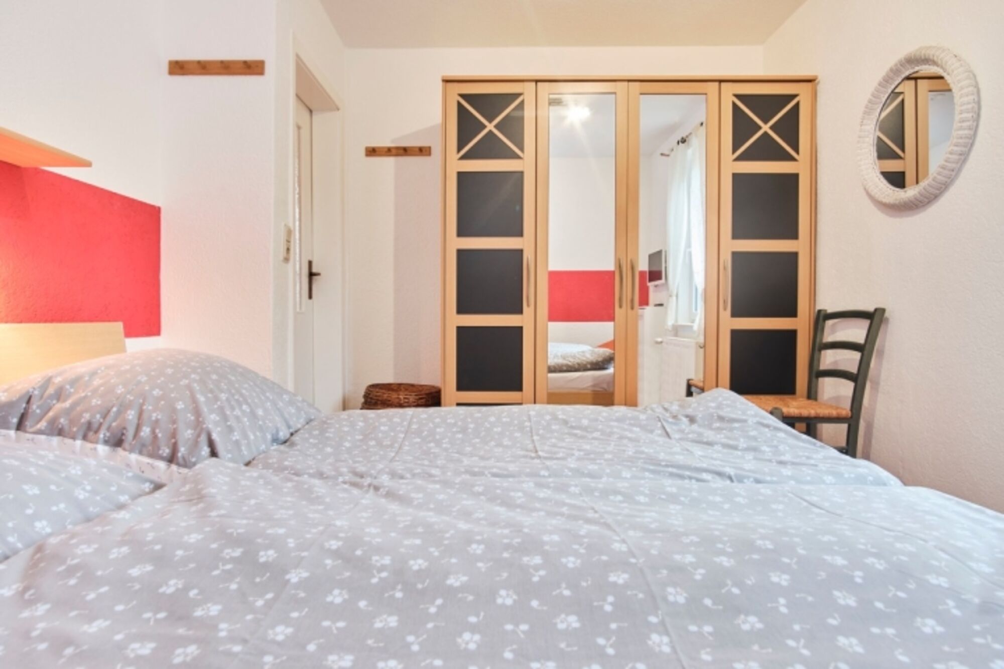 Schlafzimmer: 1 Schlafraum mit 1 Doppelbett (2 x 0,80 x 2,00); TV, Flachbildschirm; Fußboden: Laminat Doppelbett 1,60 x 2,00m