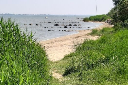 Eine Bademöglichkeit (kleiner Naturstrand) mit einem fantastischen Blick auf Rügen ist nur ca. 100 m entfernt.