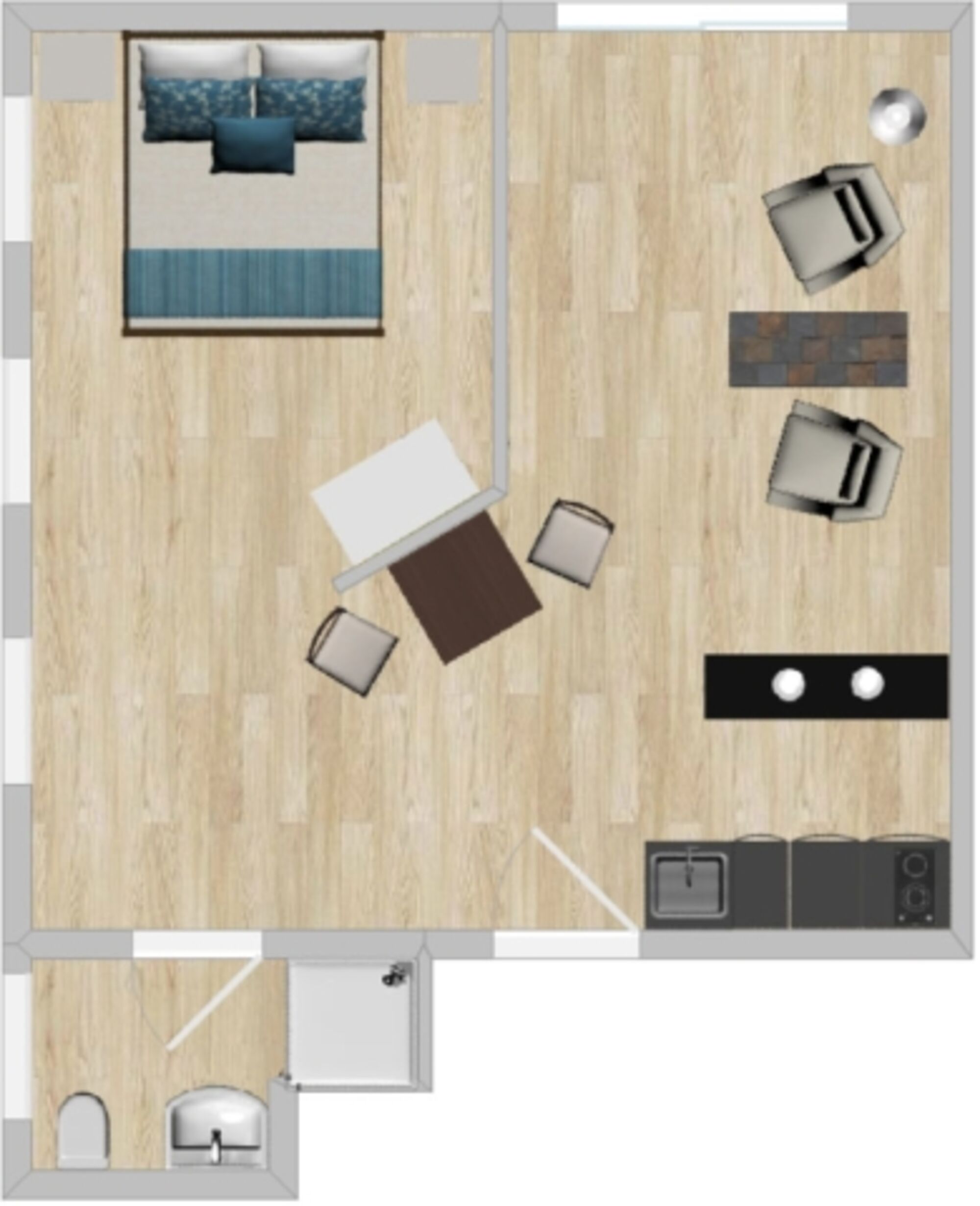 2-Platten Herd, Cerankochfeld, Kühlschrank mit Gefrierfach, Mixer, Korkenzieher / Flaschenöffner, Gewürze (Salz, Pfeffer, Zucker), Geschirrhandtücher, Mülltüten