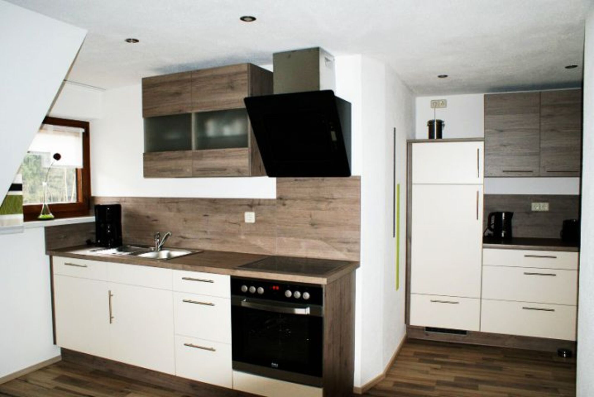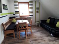 Unsere Ferienwohnung liegt im Dachgeschoss und besteht aus einem Schlafzimmer, einer Wohnküche mit einer gut ausgestatteten Küchenzeile, einen Essplatz, einer Schlaf-Couch und einem Bad mit Dusche und WC