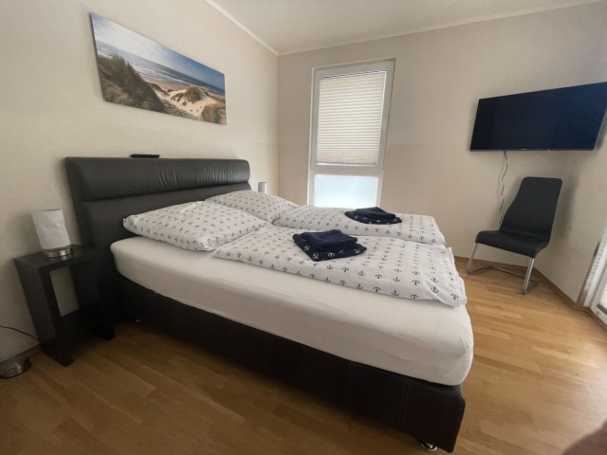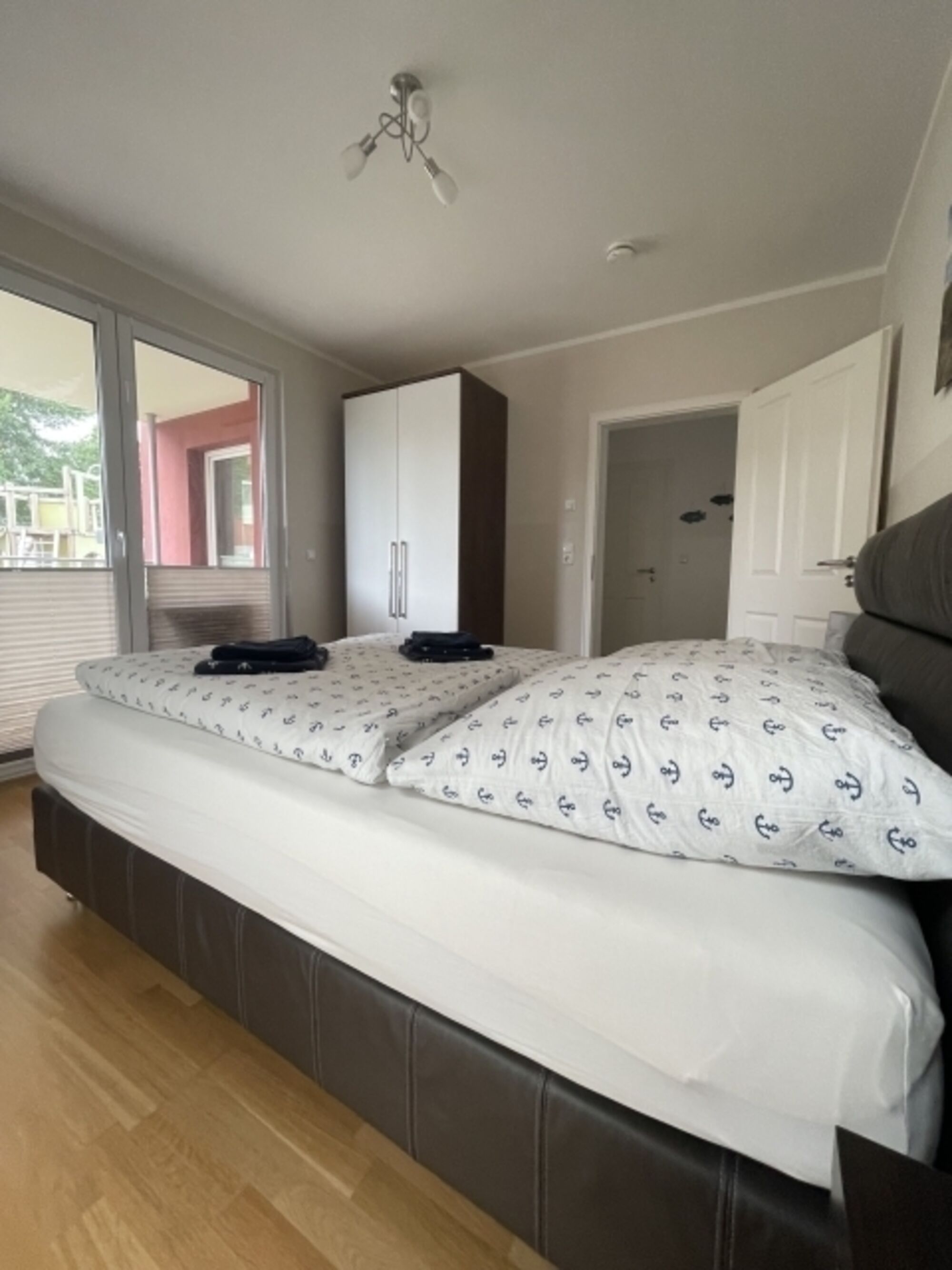 Schlafzimmer mit einem großen Doppelbett (180x200) und Schrank