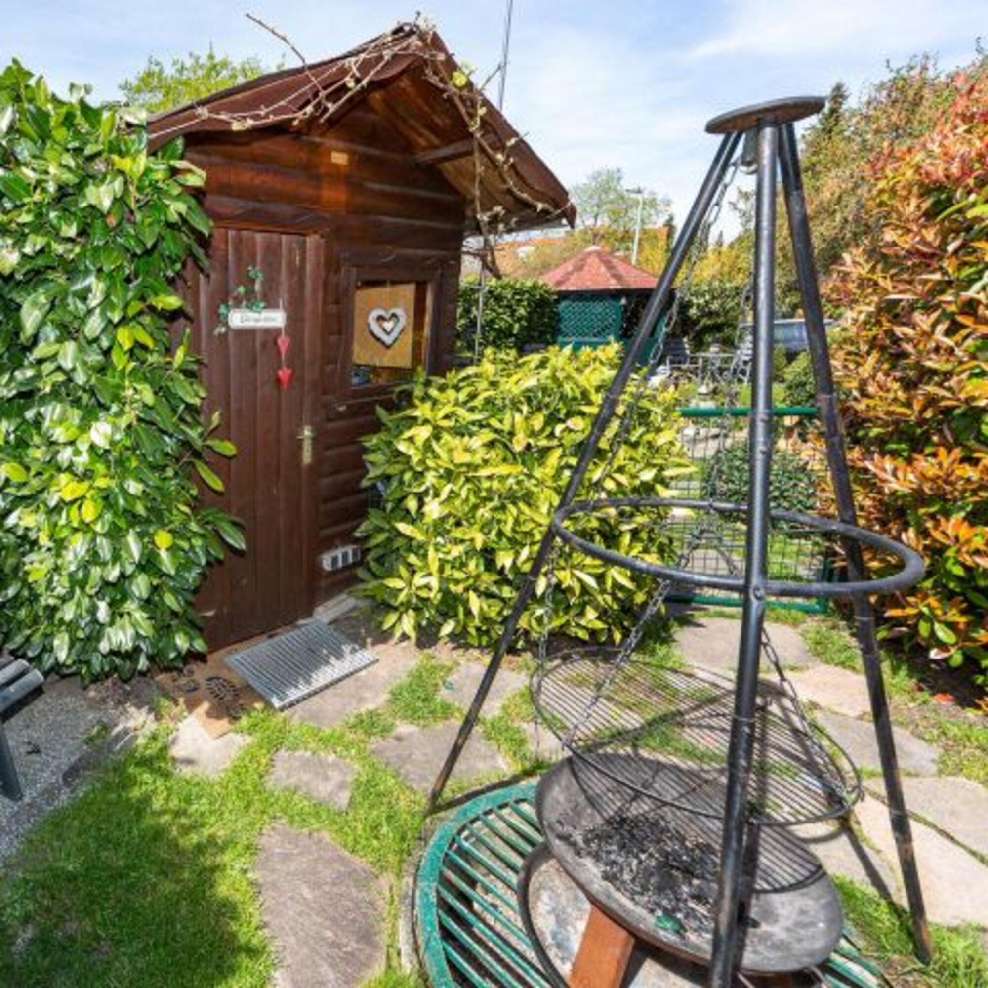 Liegewiese, Gartenmöbel, Kohlegrill, Bänke, Holzgrill, Hof, Windschutz