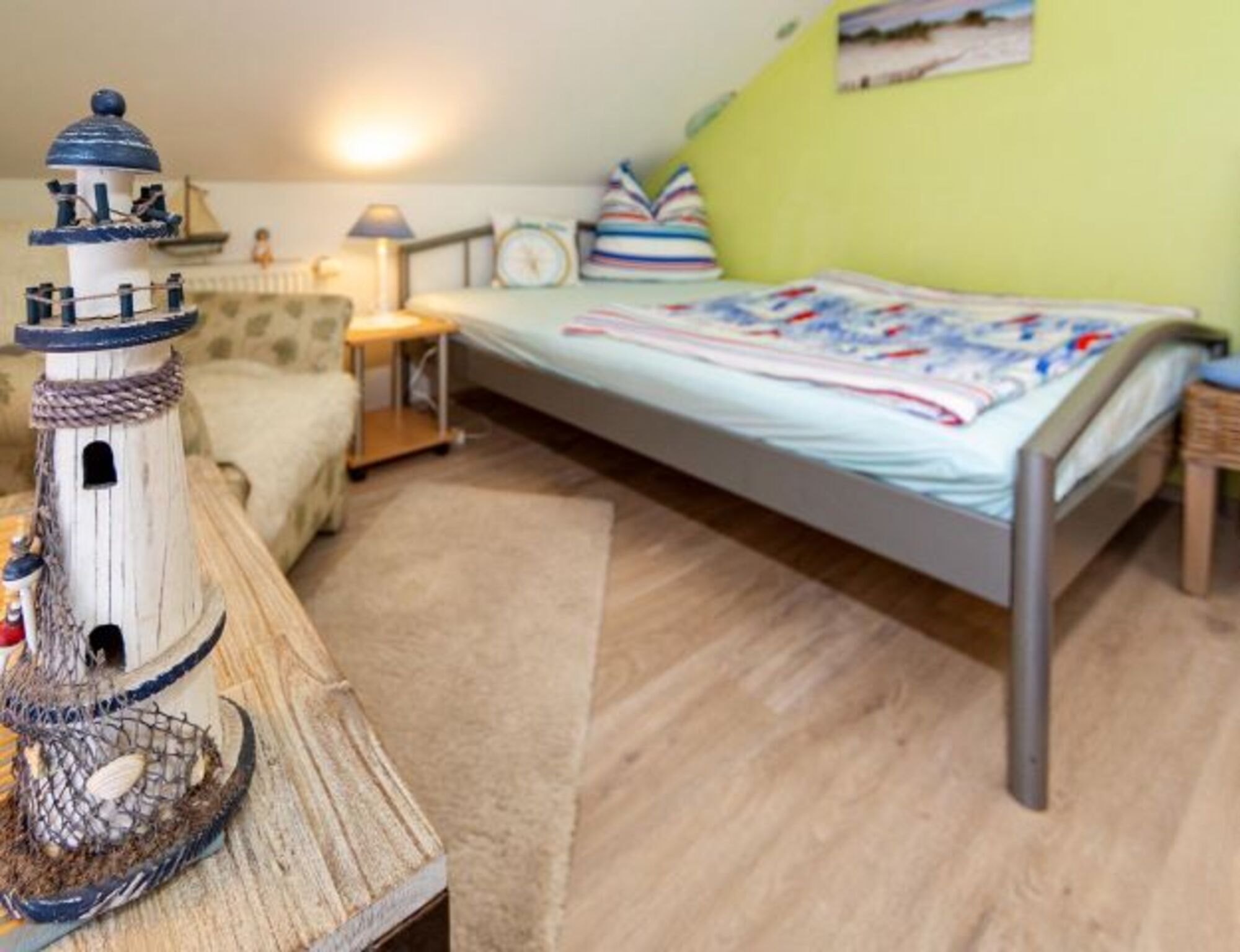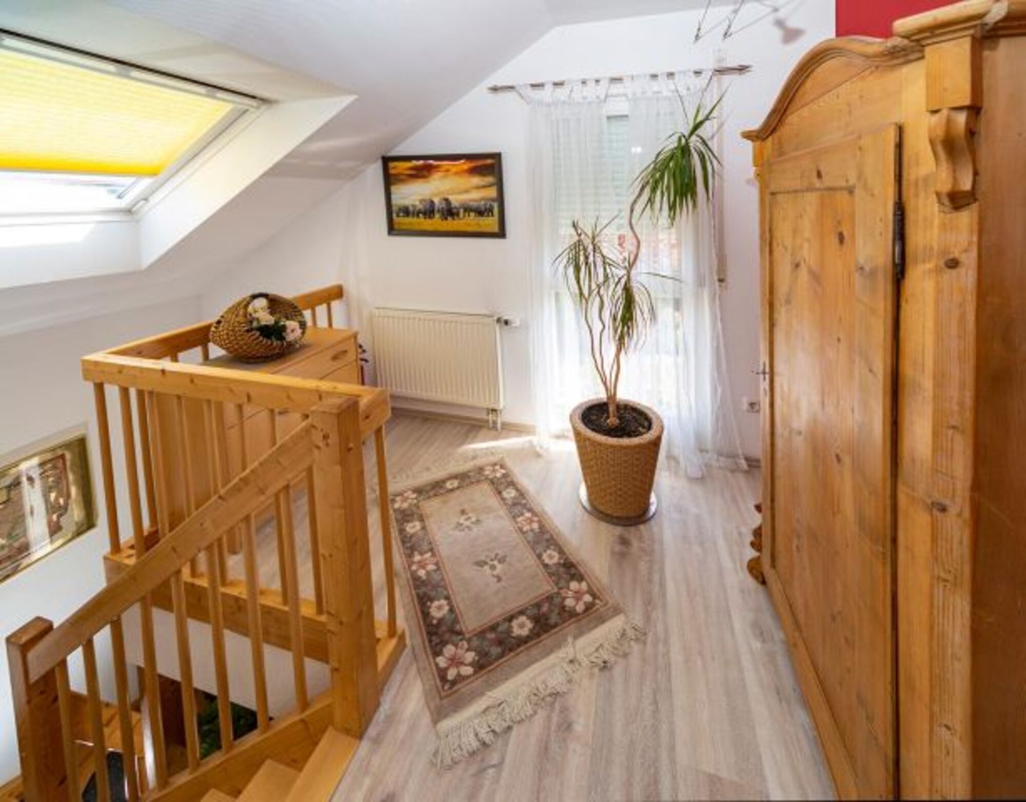 Im Wohnzimmer und im Schlafzimmer befindet sich ein Flachbildschirm. Eine gut begehbare Holztreppe führt in das Dachgeschoss mit Dachschrägen,