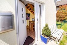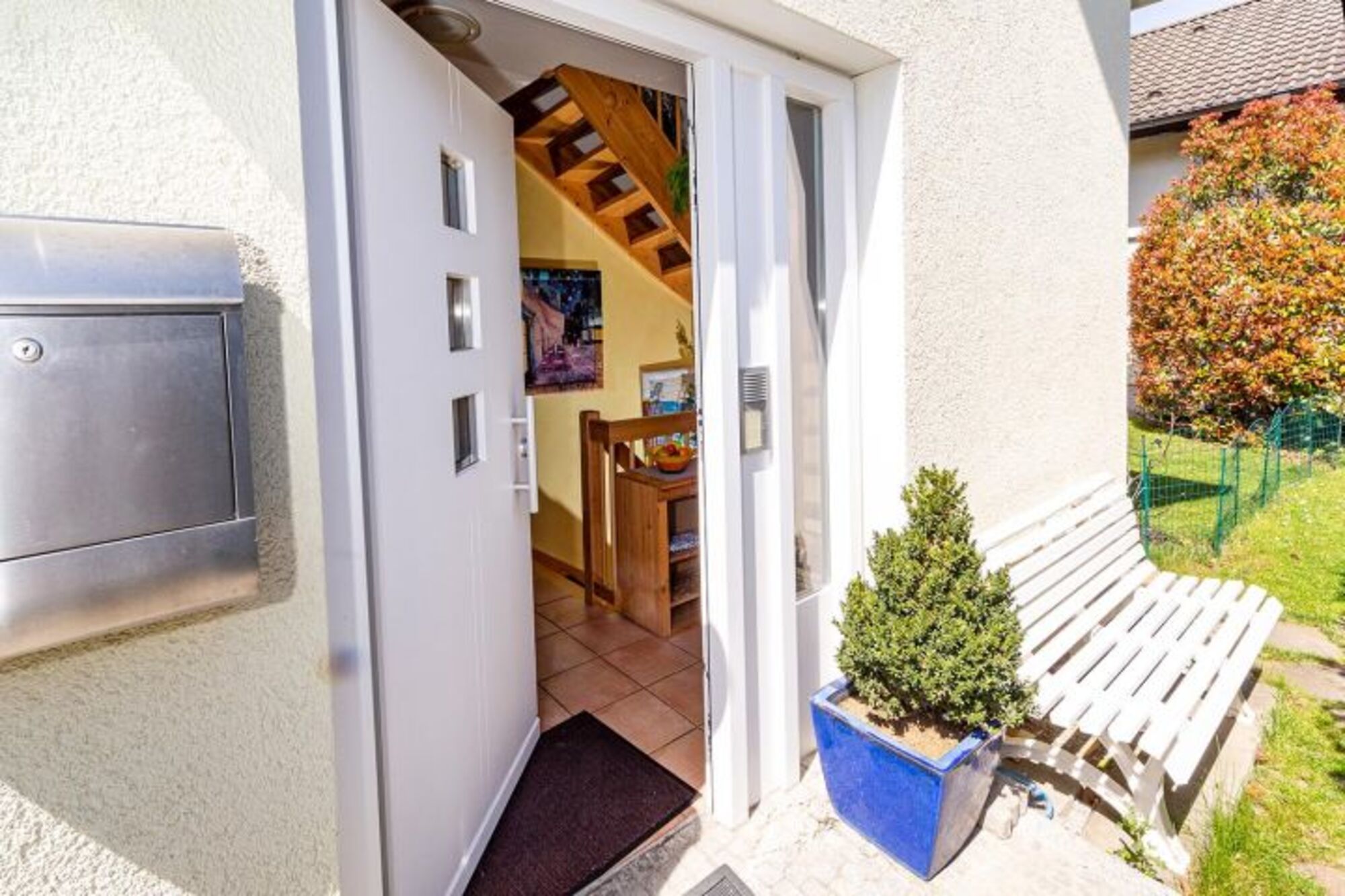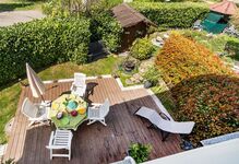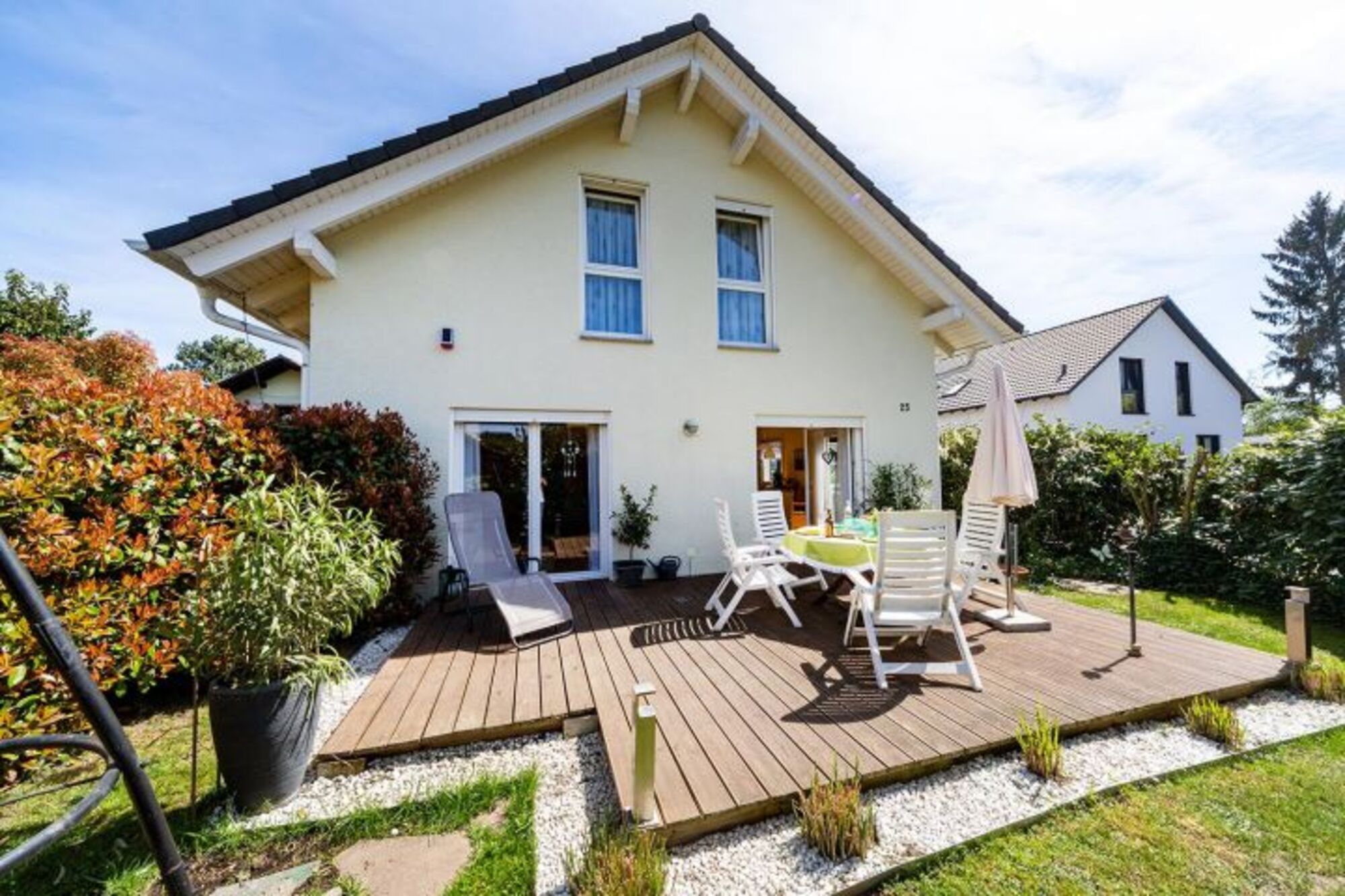 Der Garten des freistehenden Hauses ist durch eine hohe Hecke von der wenig befahrenen Seitenstraße abgetrennt. Der Garten verfügt über einen schönen Grillplatz, Gartenmöbel, einen Sonnenschirm sowie einer Sonnenliege. Der Garten ist über mehrere Türen vom Wohn-, Essbereich begehbar. Parkmöglichkeiten sind auf der Straße ausreichend vorhanden.