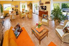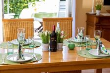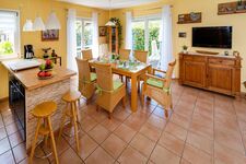Im ca. 70 qm großen Erdgeschoss befindet ein Schlafzimmer mit Doppelbett, ein großes Bad mit Dusche und WC, sowie der offene, helle Wohn- Essbereich, mit einer voll ausgestatteten Küche, die durch eine Theke abgetrennt ist und zusätzlich über eine Geschirrspülmaschine und einen Mikrowellenherd verfügt.