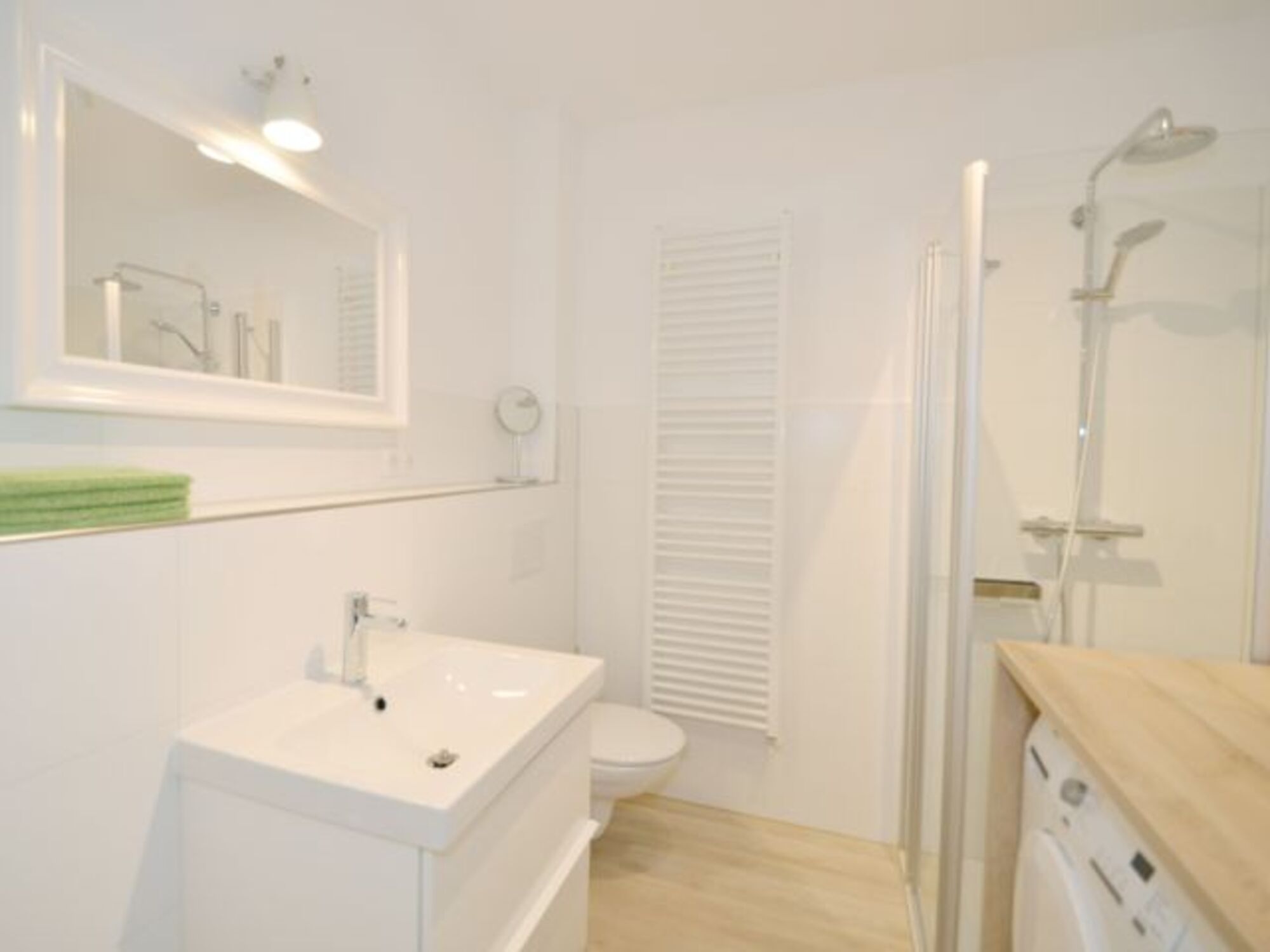 Das Bad überzeugt mit Rainshower-Dusche, Handtuchheizkörper und viel Ablageplatz.