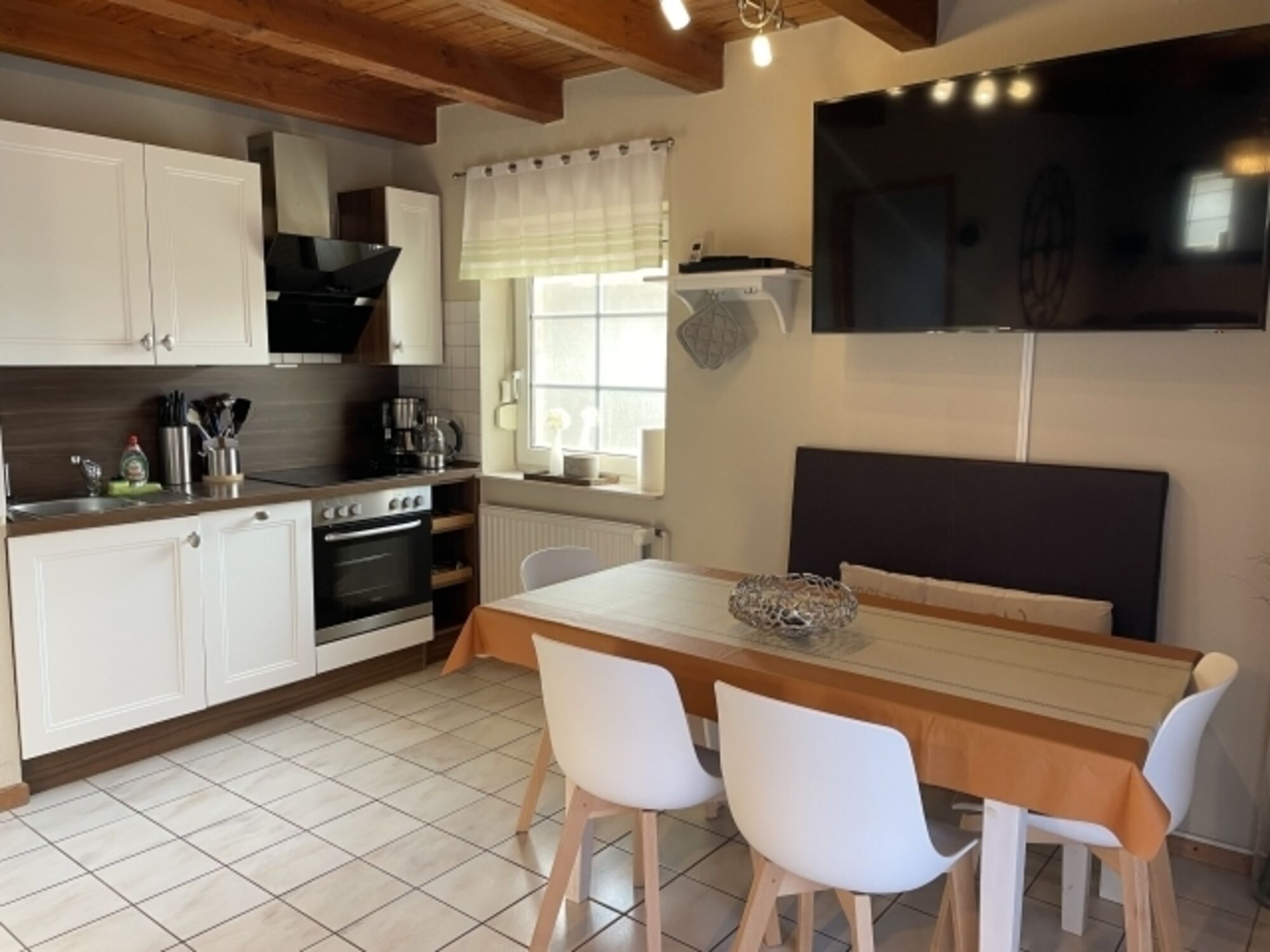TV und Blue-Ray-Player sind WLAN fähig und kommunizieren miteinander ohne Kabelverlegung. In der gut ausgestatteten Küche befindet sich neben einer normalen Filterkaffeemaschine auch eine Kapselmaschine von Tschibo u. eine Tassimomaschine, wo Sie Kaffee, Tee und heiße Schokolade zubereiten können.
