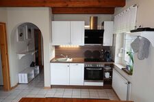 Cerankochfeld, Dunstabzugshaube, Kühlschrank mit Gefrierfach, Waffeleisen, Korkenzieher / Flaschenöffner, Essplatz in der Küche